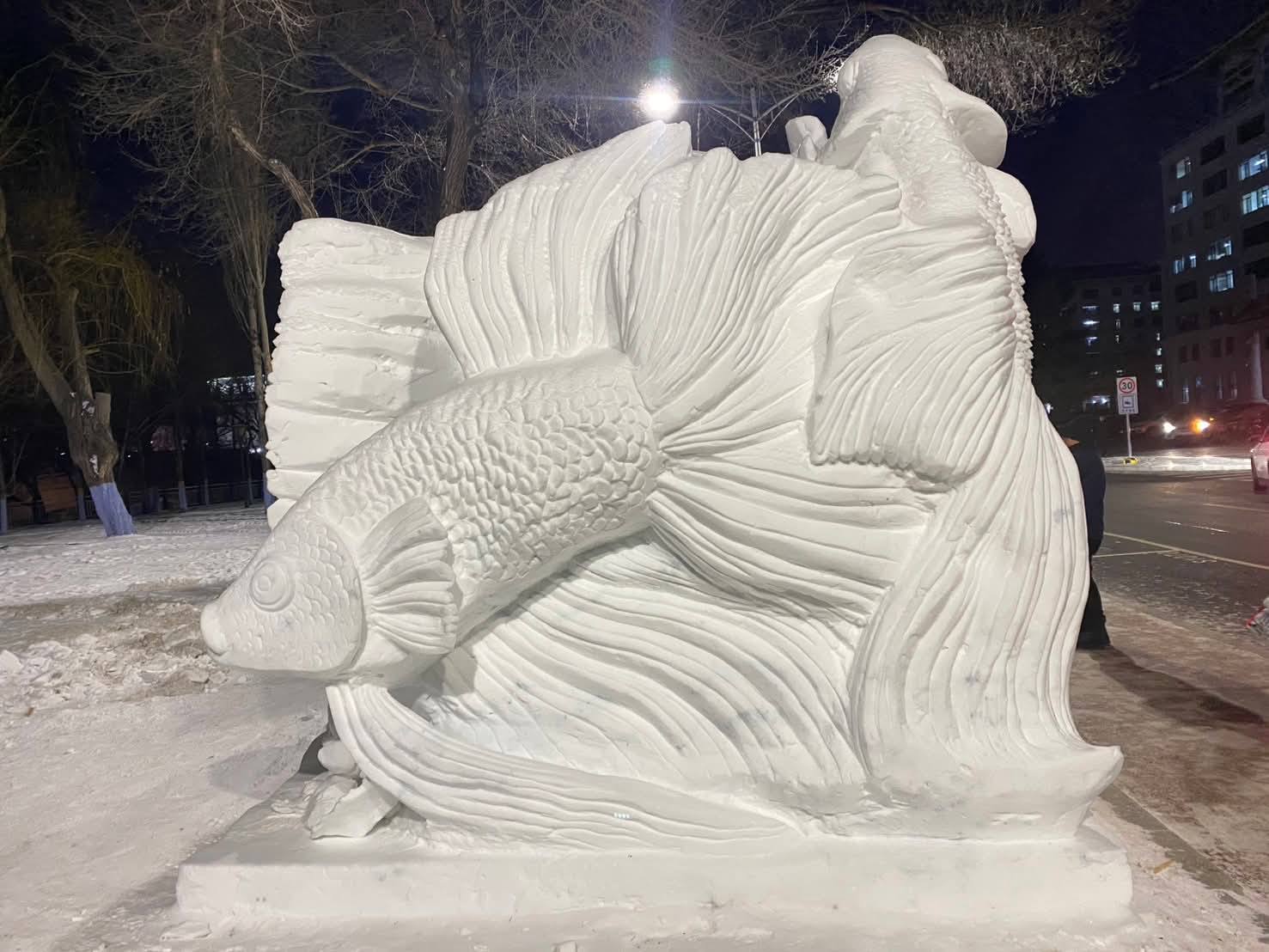 การจัดลำดับการว่ายของปลากัดทั้งสี่จึงไม่เพียงเป็นสัญลักษณ์ของการพัฒนาความรู้ แต่ยังสะท้อน “การฟันฝ่า” เส้นทางชีวิตอันเปี่ยมความพยายาม เหมือนปลากัดที่ต้องต่อสู้เพื่อรอด เติบโต และเปล่งประกายด้วยตัวของมันเอง ดอกบัวที่กึ่งกลางองค์ประกอบจึงกลายเป็นศูนย์รวมของการงอกงามทางสติปัญญา ขณะที่ลูกโลกด้านหลัง แทนเป้าหมายสำคัญในการพัฒนา คือการก้าวออกไปสู่สายตาของโลกด้วยคุณค่า ความคิดสร้างสรรค์ และอัตลักษณ์แบบไทย เมื่อสัญลักษณ์ปลากัด บัว และลูกโลก ได้ผสานเข้ากับ “หิมะ” ซึ่งเป็นวัสดุหลักในการแข่งขันครั้งนี้ หิมะจึงไม่ใช่เพียงสภาพแวดล้อมอันเยือกเย็น หากแต่เป็น ความท้าทายใหม่ และในขณะเดียวกันก็เป็น พื้นที่แห่งโอกาสใหม่ เพราะงานแกะสลักหิมะต้องการความประณีต ความอดทน และสมาธิ เหมือนเส้นทางของผู้เรียนที่ต้องใช้ปัญญา ความพยายาม และความกล้าฝัน เพื่อก้าวข้ามข้อจำกัดและเติบโตในทุกสถานการณ์ ดังนั้น ผลงานนี้จึงเป็นภาพแทนของการเดินทางจาก “ผู้เรียนรู้” สู่ “ผู้เบ่งบาน” ที่พร้อมนำความเป็นไทยออกสู่เวทีนานาชาติด้วยความภาคภูมิใจ “สร้างฝันด้วยหิมะ จุดประกายอนาคตด้วยสติปัญญา”