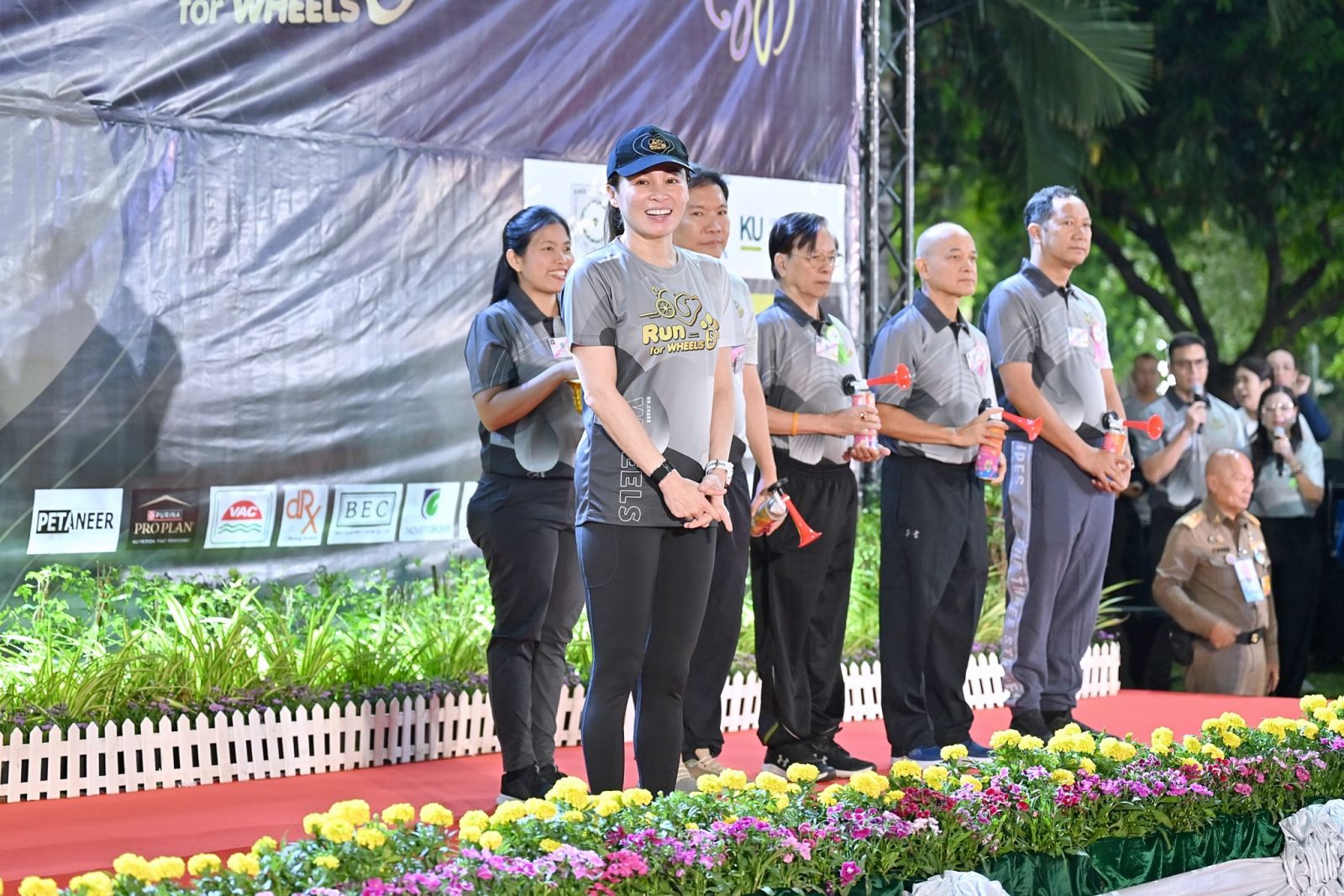 เมื่อเสด็จพระราชดำเนินถึงหอประชุมใหญ่ มหาวิทยาลัยเกษตรศาสตร์ บางเขน นายดำรงค์ ศรีพระราม รักษาการแทนอธิการบดีมหาวิทยาลัยเกษตรศาสตร์ นายคงศักดิ์ เที่ยงธรรม รองอธิการบดีฝ่ายวิชาการและการเรียนรู้ รองศาสตราจารย์ นายสัตวแพทย์พิบูล ไชยอนันต์ ประธานมูลนิธิ ศาสตราจารย์ จักรพิชัยรณรงค์สงคราม พร้อมด้วยคณะกรรมการจัดการแข่งขัน ฯ เฝ้าทูลละอองธุลีพระบาทรับเสด็จ จากนั้น ทรงพระดำเนินไปยังจุด “สตาร์ท” (START) พระราชทานพระราชวโรกาสให้ นายดำรงค์ ศรีพระราม รักษาการแทนอธิการบดีมหาวิทยาลัยเกษตรศาสตร์ กราบบังคมทูลรายงานการจัดงานการแข่งขันวิ่ง โครงการ “รัน ฟอร์ วีลส์#๕ (Run for Wheels#5) วิ่งเพื่อให้หมาได้วิ่ง ครั้งที่ ๕” ซึ่งมีวัตถุประสงค์เพื่อนำเงินรายได้หลังหักค่าใช้จ่ายไปจัดทำวีลแชร์ให้แก่สัตว์พิการ และสนับสนุนจัดซื้อเครื่องมือทางการแพทย์ให้แก่คณะสัตวแพทยศาสตร์ มหาวิทยาลัยเกษตรศาสตร์ บางเขน ต่อจากนั้น ทรงกดแตรสัญญาณปล่อยขบวนนักวิ่ง และนักวิ่งพร้อมสุนัข (ระยะทาง ๑๐ กิโลเมตร) และทรงกดแตรสัญญาณปล่อยขบวนนักวิ่ง และนักวิ่งพร้อมสุนัข (ระยะทาง ๓ กิโลเมตร)