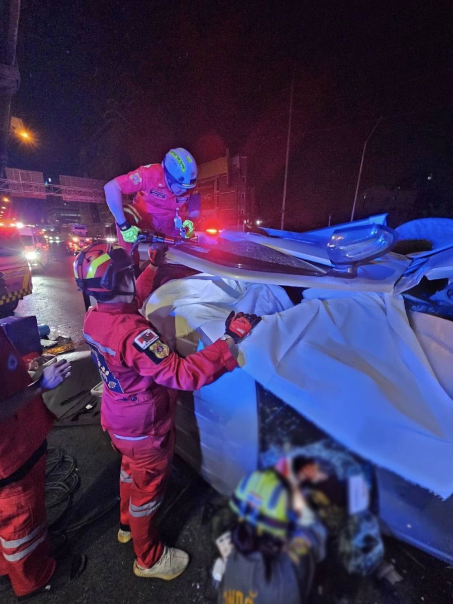 ที่เกิดเหตุ พบรถกระบะ ฟอร์ต สีขาว ลักษณะชนขอบทางกั้น ตรวจสอบพบว่ามีผู้ได้รับบาดเจ็บ 1 ราย ติดอยู่ภายในยานพาหนะ ทางอาสากู้ภัยร่วมดำเนินการใช้เครื่องมือตัดถ่างงัดรถ เพื่อนำผู้บาดเจ็บออกมา พื้นที่ สน.วิภาวดี