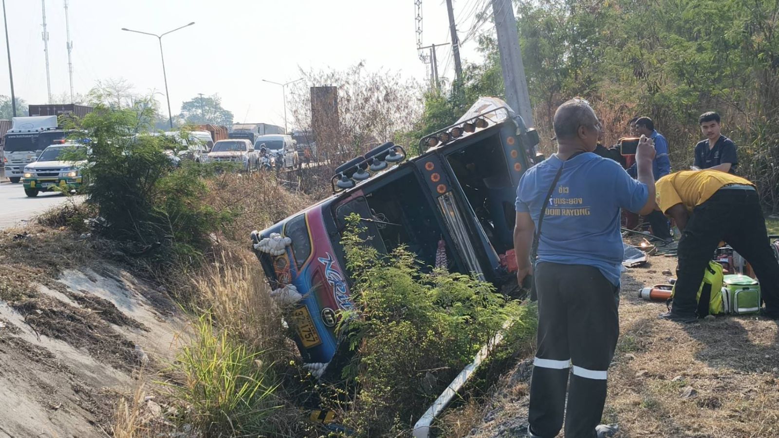 วันที่ 15 มกราคม 2568 เมื่อเวลา 08.30 น. ศูนย์วิทยุหน่วยกู้ภัยเพียวเยี้ยงไท้ศรีราชา รับแจ้งเหตุรถบัสรับส่งพนักงานโรงงานเสียหลักพลิกคว่ำ บริเวณหน้าปิ่นทอง3 ถ.331 ตัดใหม่ มุ่งหน้าแหลมฉบัง ม.4 ต.หนองขาม อ.ศรีราชา จ.ชลบุรี จึงรุดไปตรวจสอบพร้อมเจ้าหน้าที่ตำรวจ สภ.หนองขาม และหน่วยกู้ภัยเพียวเยี้ยงไท้ศรีราชา