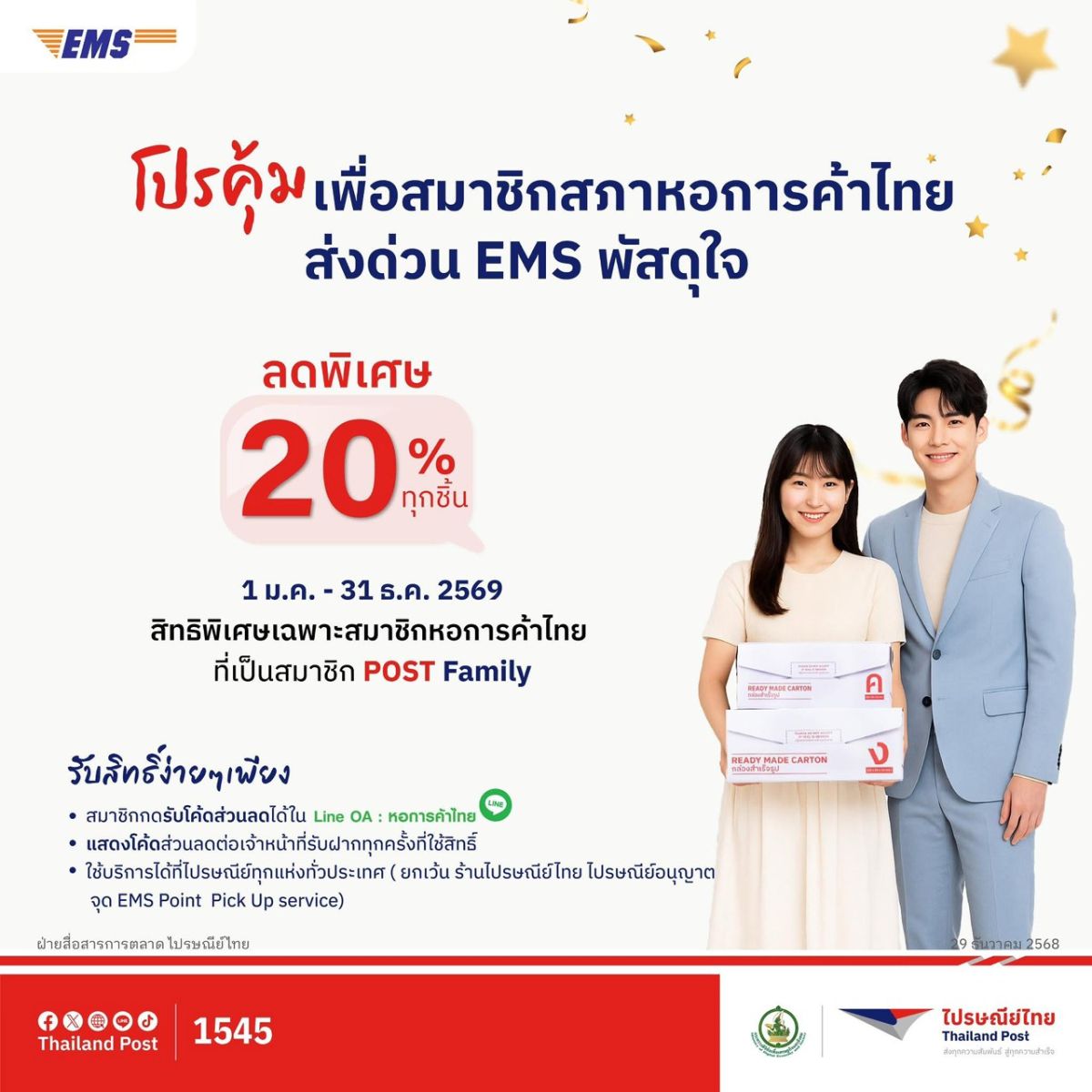 นอกจากนี้ ไปรษณีย์ไทยยังตอกย้ำบทบาทในฐานะพันธมิตรด้านโลจิสติกส์ ที่ช่วยขับเคลื่อนการค้าและธุรกิจไทยในทุกระดับผ่านโปรคุ้มเพื่อสมาชิกสภาหอการค้าไทยส่งด่วน EMS พัสดุใจ มอบส่วนลดพิเศษ 20% ทุกชิ้นตลอดทั้งปี ตั้งแต่วันนี้ จนถึงวันที่ 31 ธันวาคม 2569 สำหรับสมาชิก หอการค้าไทยที่เป็นสมาชิก POST Family เพื่อเสริมศักยภาพผู้ประกอบการ SMEs และภาคธุรกิจในการจัดส่งสินค้าอย่างมีประสิทธิภาพ เพียงกดรับโค้ดส่วนลดผ่าน Line OA : หอการค้าไทย และแสดงโค้ดส่วนลดต่อเจ้าหน้าที่รับฝากทุกครั้งที่ใช้สิทธิ์