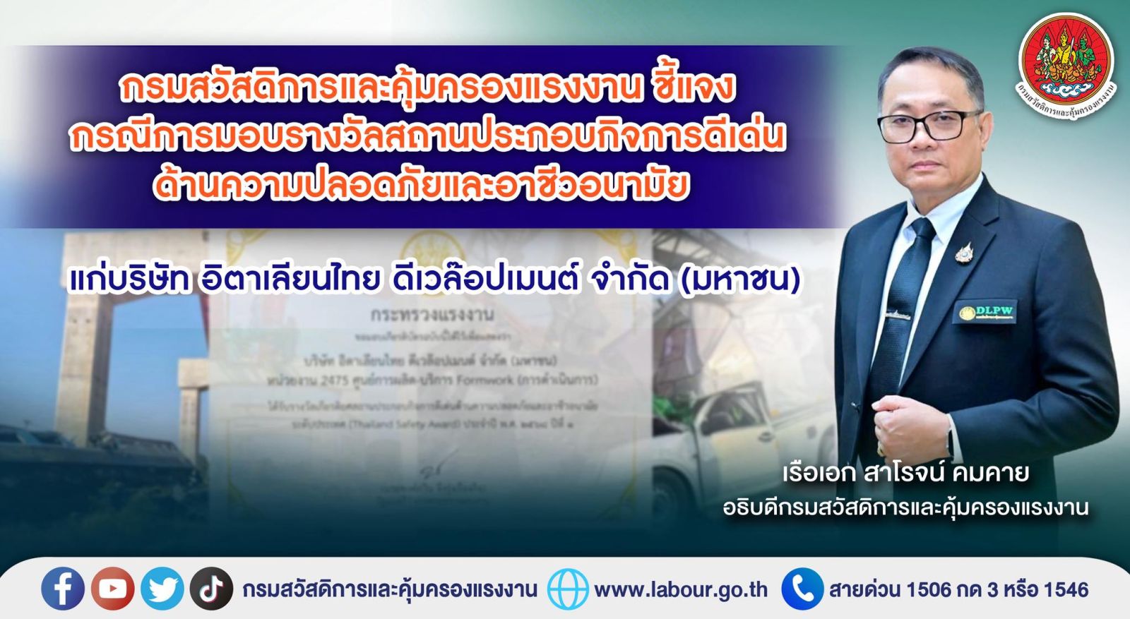 วันนี้ (19 ม.ค.2569) ร.อ.สาโรจน์ คมคาย อธิบดีกรมสวัสดิการและคุ้มครองแรงงาน เปิดเผยว่า จากกรณีที่ปรากฏภาพเกียรติบัตรรางวัลสถานประกอบกิจการดีเด่นด้านความปลอดภัยและอาชีวอนามัย (Thailand Safety Award) ซึ่งกรมสวัสดิการและคุ้มครองแรงงานมอบให้แก่บริษัท อิตาเลียนไทย ดีเวล๊อปเมนต์ จำกัด (มหาชน) และมีการเผยแพร่ผ่านสื่อมวลชนในขณะนี้ กรมสวัสดิการและคุ้มครองแรงงานขอชี้แจงข้อเท็จจริงเพื่อความเข้าใจที่ถูกต้องของสังคม ดังนี้