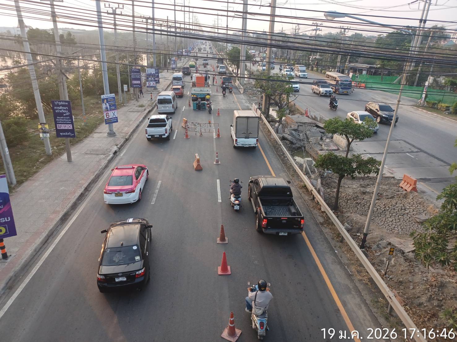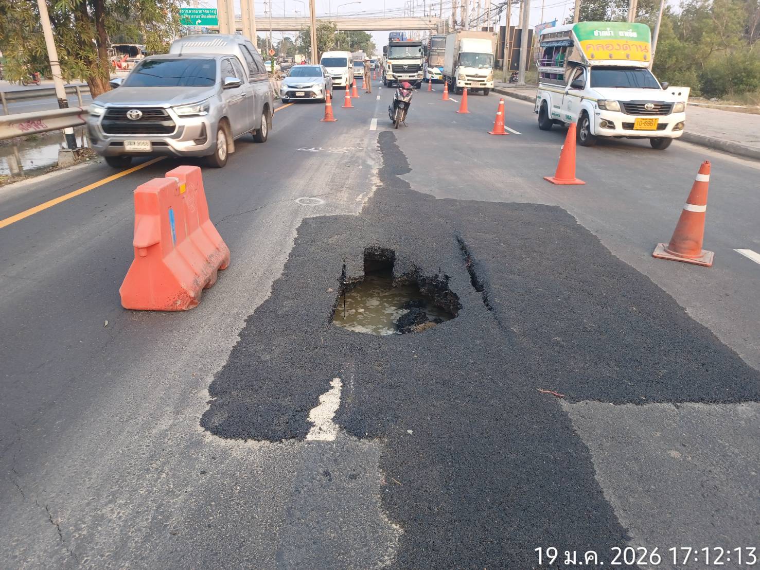 เหตุเกิดตั้งแต่เวลา 09.00 น. (19 ม.ค.69) ผู้นับเหมาได้ทำการปิดท่อน้ำและซ่อมผิวจราจร เสร็จสิ้น เวลา 11.00 น เปิดให้รถวิ่งใช้งานตามปกติ จนเวลา 15.00 น ถนนจุดดังกล่าว ได้เกิดการทรุดตัวลง ลึกประมาณ 80 ซม ยาว 1.5 เมตร ช่างได้เข้าดำเนินการซ่อมแซม โดยการปิดการจราจรช่องกลาง 1 เลน ใช้ได้ 2 เลน ช่องทางขวาสุด และซ่องทางซ้ายสุด ได้จัดกำลังจราจร และ อาสา 5 นาย อำนวยความสะดวก ขณะนี้ ยังไม่สามรถดำเนินการเนื่องจากต้องใช้รถขนาดใหญ่เข้าดำเนินการ โดยจะให้เข้ามาดำเนินการในเวลา 20.00 น. เป็นต้นไป