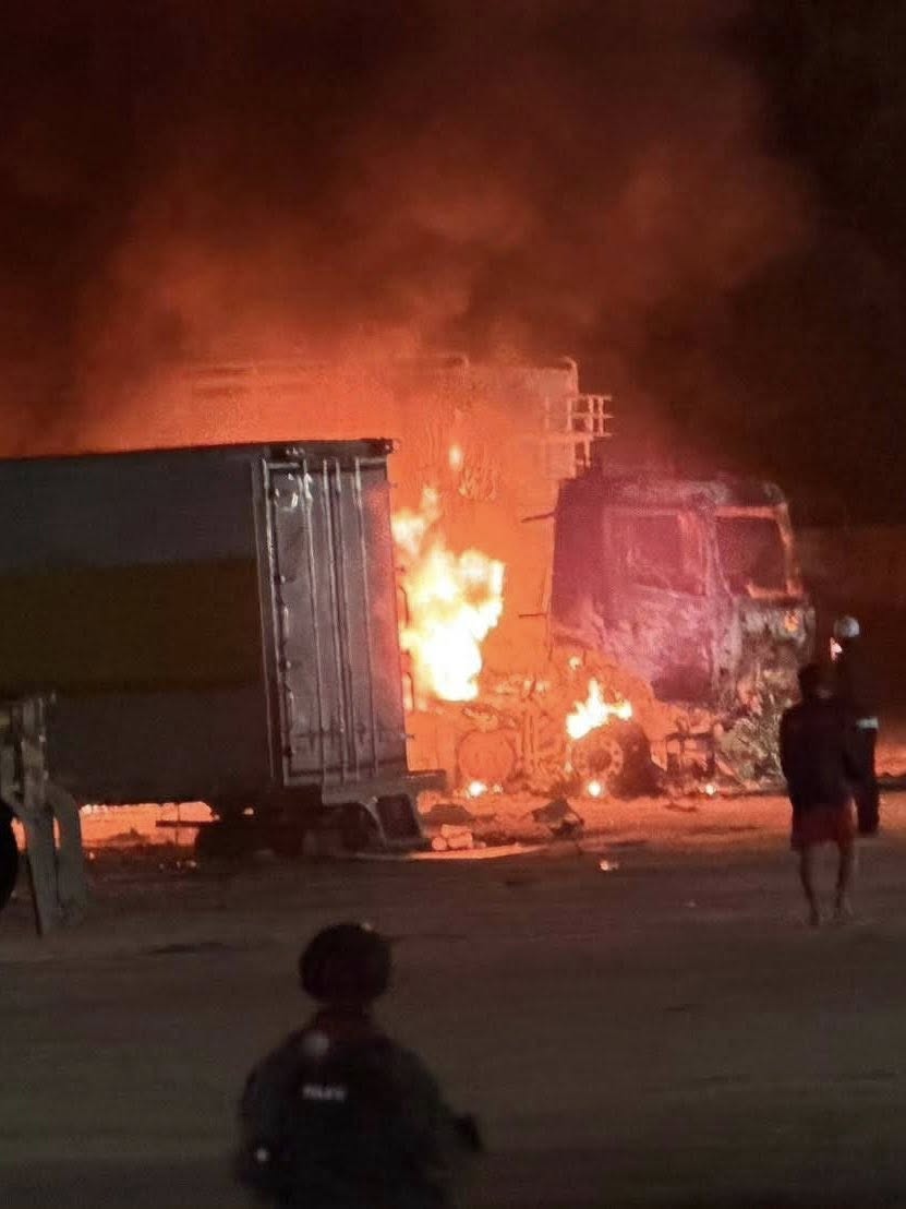 ภายหลังรับแจ้งเจ้าหน้าที่ตำรวจจึงเข้าตรวจสอบที่เกิดเหตุ จากการตรวจสอบเบื้องต้น ในที่เกิดเหตุพบเพลิงกำลังลุกไหม้ส่วนหัวลากของรถบรรทุกพ่วงอย่างรุนแรง