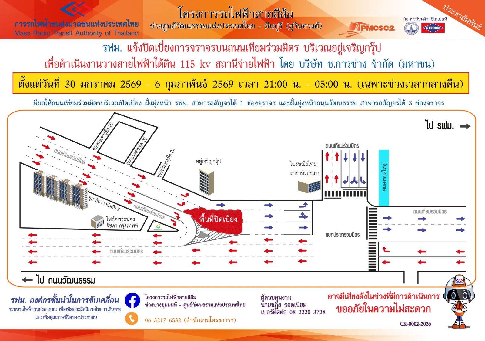 ประชาสัมพันธ์ แจ้งปิดเบี่ยงการจราจรบนถนนเทียมร่วมมิตร บริเวณอยู่เจริญกรุ๊ป เพื่อดำเนินงานวางสายไฟฟ้าใต้ดิน 115 kv สถานีจ่ายไฟฟ้าโครงการรถไฟฟ้าสายสีส้ม ช่วงศูนย์วัฒนธรรมแห่งประเทศไทย - มีนบุรี (สุวินทวงศ์) ตั้งแต่วันที่ 23 มกราคม 2569 – 6 กุมภาพันธ์ 2569 เวลา 21:00 น. – 05:00 น. (เฉพาะช่วงเวลากลางคืน) มีรายละเอียดดังนี้