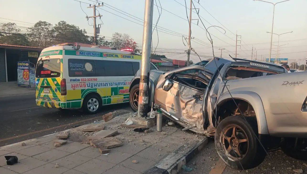 กระบะเสียหลักฟาดเสาไฟส่องสว่างเกาะกลาง มีผู้เสียชีวิต 2 รายในซากรถ จ.ราชบุรี