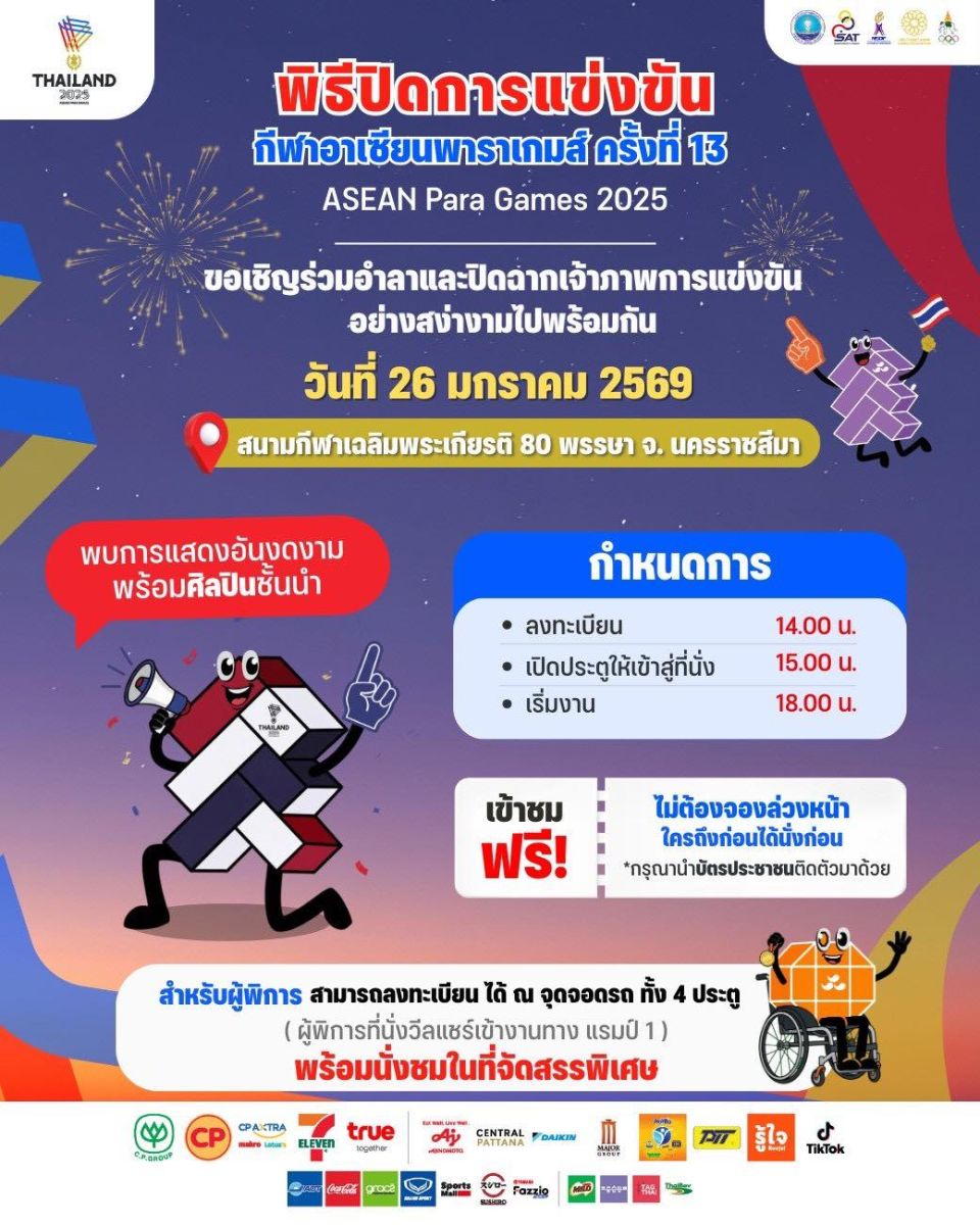 สำหรับพิธีปิดการแข่งขันกีฬาอาเซียนพาราเกมส์ ครั้งที่ 13 จะมีขึ้นในวันที่ 26 มกราคม 2569 ณ สนามเฉลิมพระเกียรติ 80 พรรษา 5 ธันวาคม 2550 จ.นครราชสีมา เวลา 18.00 น. ถ่ายทอดสดทาง PPTV, NBT, T Sports 7 และ TrueVisions NOW