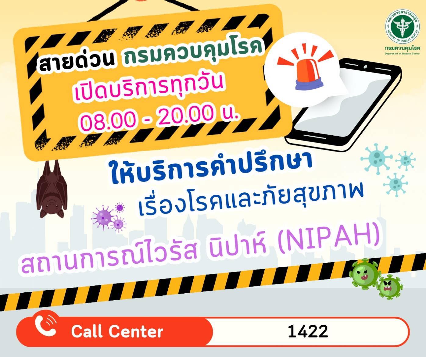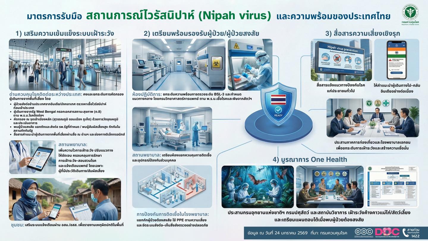 กระทรวงสาธารณสุข แจงโรคติดเชื้อไวรัสนิปาห์แม้ความรุนแรงสูงแต่ติดต่อยาก รัฐเบงกอลยังพบผู้ป่วย 2 ราย เท่าเดิม ขณะที่ไทยค้างคาวแม่ไก่พบเชื้อเพียง 10% ยังไม่พบการติดเชื้อในสุกรหรือคน แนะวิธีป้องกันในผู้ที่อาศัยพื้นที่มีค้างคาว พร้อมวาง 4 มาตรการเฝ้าระวังป้องกันเชื้อจากต่างประเทศ เน้นคัดกรองเที่ยวบินตรงจากรัฐเบงกอล เข้มเฝ้าระวังในสถานพยาบาลและชุมชน ย้ำผู้เดินทางไปอินเดียให้เลี่ยงพื้นที่ระบาด ไม่สัมผัสค้างคาว ไม่รับประทานผลไม้ที่มีรอยกัดแทะ หลังเดินทางกลับสังเกตอาการ 21 วัน หากผิดปกติให้พบแพทย์ทันทีพร้อมแจ้งประวัติเสี่ยง