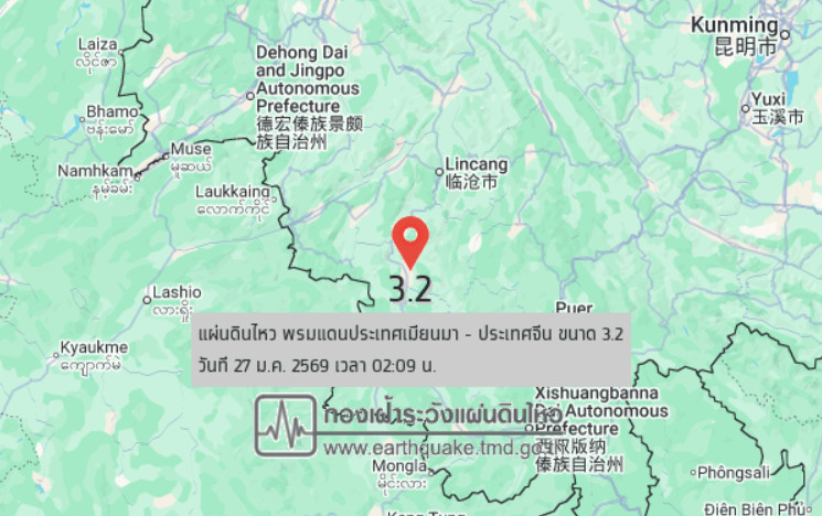 เวลา 02.09 น. วันที่ 27 มกราคม 2569 กองเฝ้าระวังแผ่นดินไหว กรมอุตุนิยมวิทยา แจ้งเหตุแผ่นดินไหว ขนาด 3.2 ความลึก 5 กม. บริเวณพรมแดนประเทศเมียนมา - ประเทศจีน ศูนย์กลางอยู่ห่างออกไปทางทิศตะวันตกเฉียงเหนือของ อ.แม่สาย จ.เชียงราย ประมาณ 303 กม. ยังไม่มีรายงานผลกระทบต่อประเทศไทย