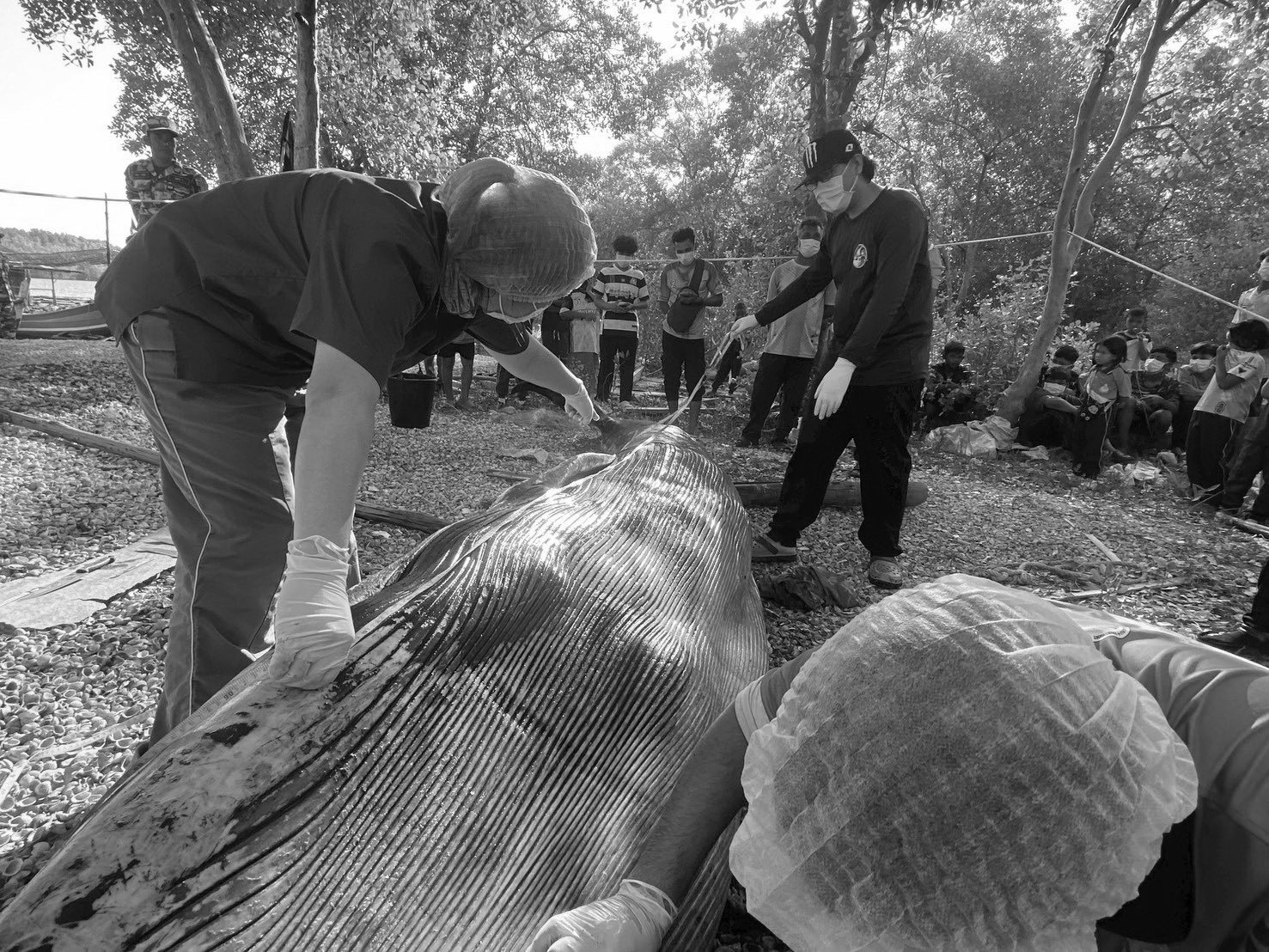 โดยคาดว่าสาเหตุโน้มนำเกิดจากการป่วยและพลัดหลงจากแม่ ทั้งนี้ เจ้าหน้าที่ได้ทำการเก็บตัวอย่างชิ้นเนื้อเพื่อนำไปวิเคราะห์ทางห้องปฏิบัติการ ตัวอย่างโครงกระดูกส่วนขากรรไกรล่าง ครีบอก กระดูกเชิงกรานและทำการจัดการซากโดยได้รับความอนุเคราะห์จากองค์การบริหารส่วนตำบลปูยู จังหวัดสตูลเพื่อใช้รถแมคโครในการขุดฝังกลบซากในพื้นที่