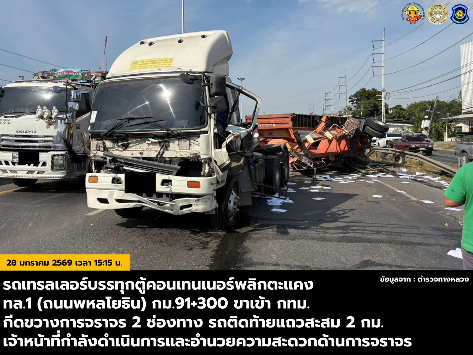 กม.91+300 อ.หนองแค จ.สระบุรี รถบรรทุกตู้คอนเทนเนอร์ พลิกตะแคง ช่องทางหลัก กีดขวาง 2 เลนซ้าย อยู่ระหว่างเคลื่อนย้าย