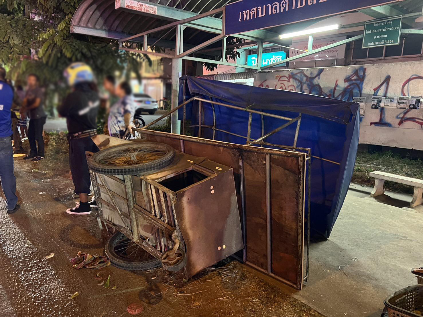 ที่เกิดเหตุ พบร่าง ชายไทย อายุ 78 ปี นอนเสียชีวิตอยู่บริเวณหน้ารถยนต์กระบะยี่ห้อ โตโยต้า สีดำ ทะเบียน กทม. ห่างออกไปเล็กน้อยพบรถเข็น 3 ล้อ อยู่ในลักษณะพลิกตะแคงอยู่บริเวณศาลาป้ายรถประจำทาง และยังพบเศษใบตองตกหล่นอยู่เต็มถนน