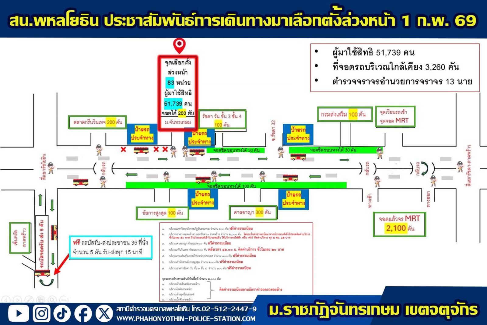เนื่องจากมีผู้ลงทะเบียนใช้สิทธิเลือกตั้งล่วงหน้าเป็นจำนวนมาก ... สถานีตำรวจนครบาลพหลโยธิน ร่วมกับสำนักงานเขตจตุจักร ขอแจ้งเตือนให้ประชาชน วางแผนการเดินทางล่วงหน้า และปฏิบัติตามแนวทางการจัดระเบียบพื้นที่ เพื่อความสะดวก รวดเร็ว และความปลอดภัยของทุกท่าน