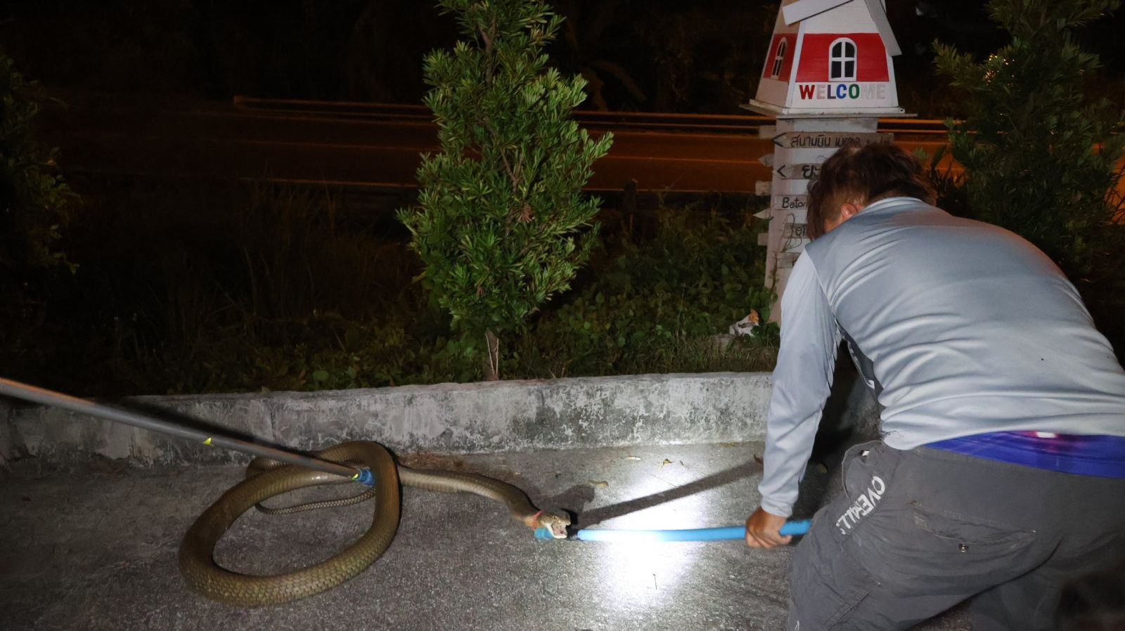 เมื่อเดินทางไปถึงพบว่าบ้านดังกล่าวเป็นบ้านปูนสองชั้น ปลูกติดกันหลายหลัง อยู่บริเวณ มีเจ้าพนักงานป้องกันและบรรเทาสาธารณภัย อบต.ยะรม ยืนคอยอยู่ และแจ้งว่า งูตัวดังกล่าวเป็นงูจงอาง อยู่ในคูน้ำหน้าบ้าน ส่วนเจ้าของบ้านผู้ที่พบงู หนีขึ้นไปหลบอยู่ระเบียบชั้นสอง ของบ้าน ไม่กล้าลงมา