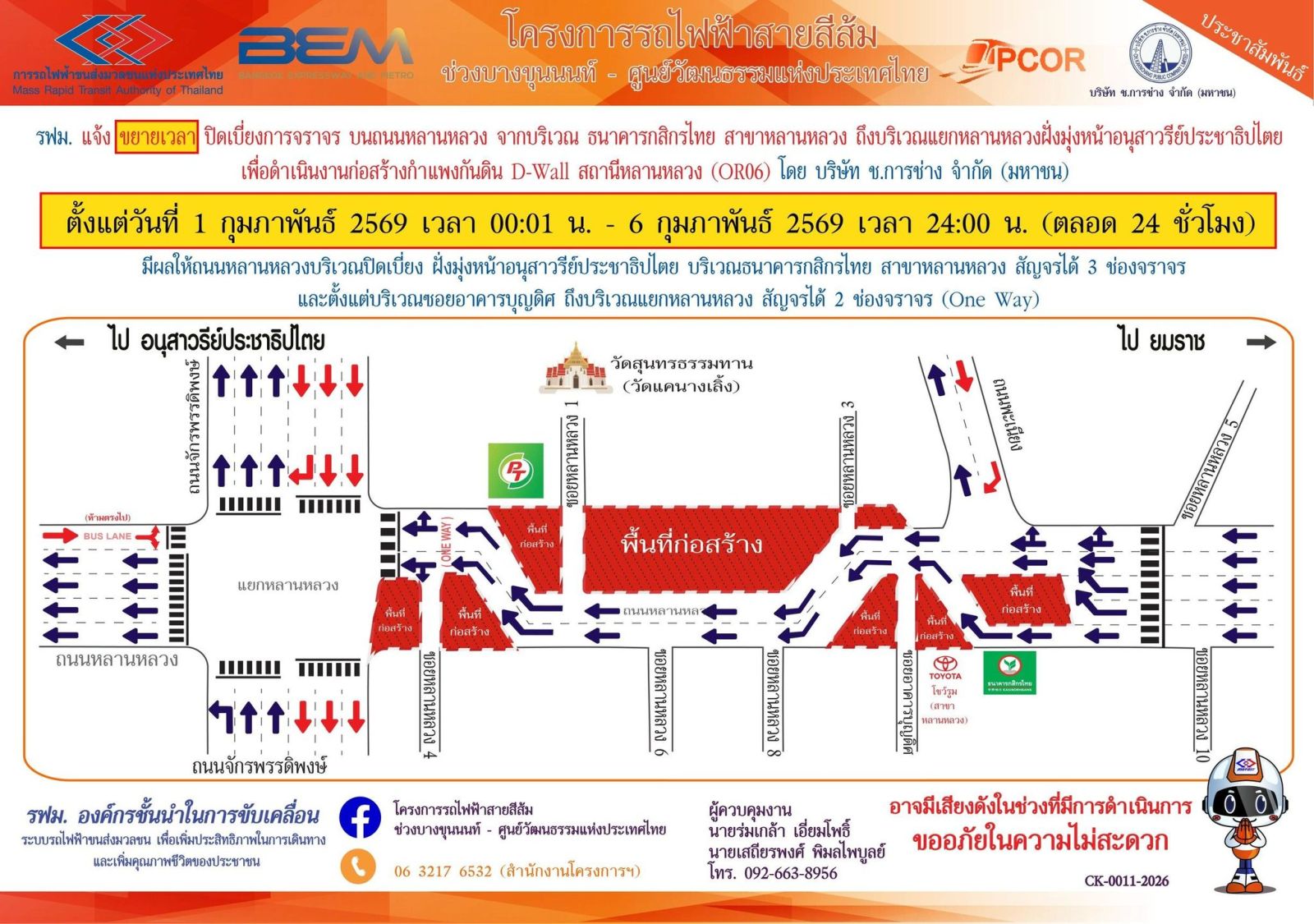 การรถไฟฟ้าขนส่งมวลชนแห่งประเทศไทย (รฟม.) แจ้งว่า บริษัท ช.การช่าง จำกัด (มหาชน) ผู้รับจ้างออกแบบและก่อสร้างอุโมงค์ทางวิ่งและสถานีใต้ดิน โครงการรถไฟฟ้าสายสีส้ม ช่วงบางขุนนนท์ – ศูนย์วัฒนธรรมแห่งประเทศไทย มีความจำเป็นต้องขยายเวลาปิดเบี่ยงการจราจร 3 ช่องจราจร บนถนนหลานหลวง จากบริเวณธนาคารกสิกรไทย สาขาหลานหลวง ถึงบริเวณแยกหลานหลวงฝั่งมุ่งหน้าอนุสาวรีย์ประชาธิปไตย เพื่อดำเนินงานก่อสร้างกำแพงกันดิน D-Wall สถานีหลานหลวง (OR06) ตั้งแต่วันที่ 1 กุมภาพันธ์ 2569 เวลา 00:01 น. – 6 กุมภาพันธ์ 2569 เวลา 24:00น. (ตลอด 24 ชั่วโมง)