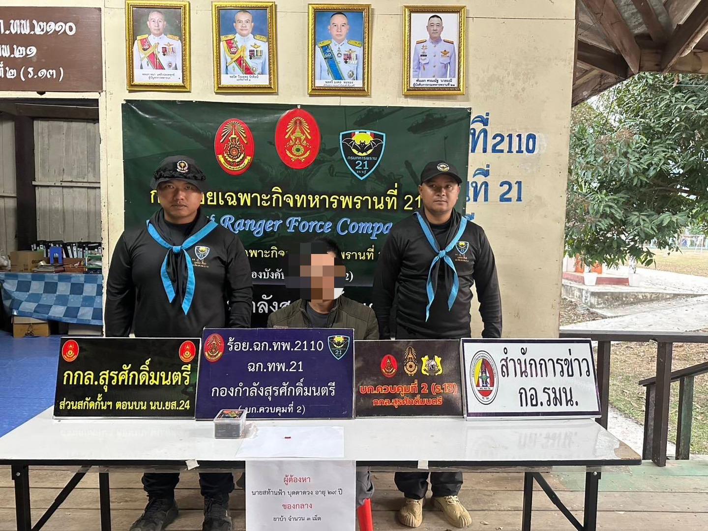 ร้อย.ฉก.ทพ.2110 ฉก.ทพ.21 จัดกำลังพลบูรณาการสนธิกำลังร่วมกับหน่วยงานความมั่นคงในพื้นที่เข้าทำการบังคับใช้กฎหมายทุกรูปแบบ เพื่อป้องกันการกระทำความผิด พื้นที่ ต.ผาตั้ง และ ต.นางิ้ว อ.สังคม จ.หนองคาย นำไปสู่การตรวจยึดจับกุมผู้ต้องหารวม 3 ราย พร้อมของกลางยาเสพติด (ยาบ้า) และอาวุธปืนแก๊ป (ไทยประดิษฐ์) เจ้าหน้าที่ได้นำผู้ต้องหาทั้งหมดล พร้อมของกลางและเอกสารหลักฐานนำส่งพนักงานสอบสวน สภ.นางิ้ว เพื่อดำเนินคดีตามกฎหมายต่อไป