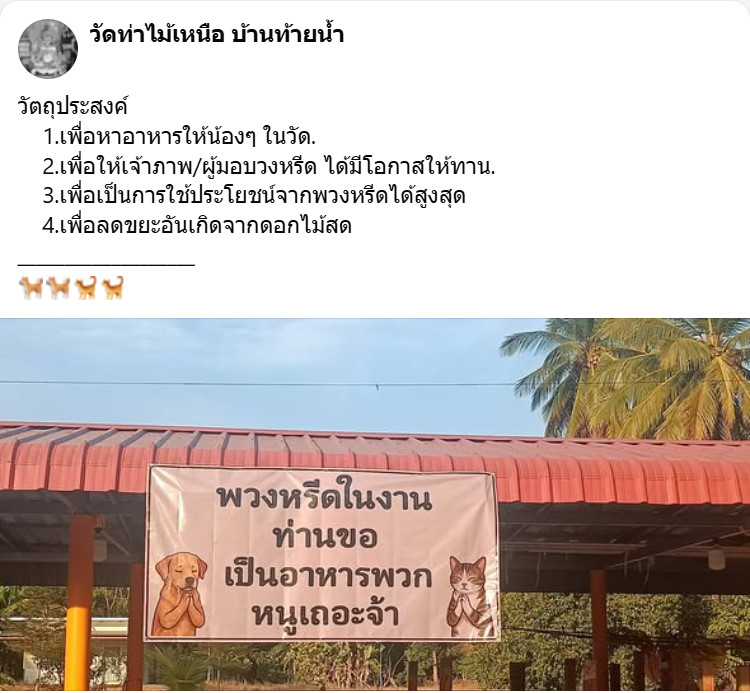 เมื่อวานนี้ เฟซบุ๊ก วัดท่าไม้เหนือ บ้านท้ายนำ จ.อุตรดิตถ์ ได้โพสต์ภาพพร้อมข้อความระบุว่า เปลี่ยนพวงหรีดในงานท่าน เป็นอาหารพวกหนูเถอะจ้า ... พร้อมกับแจ้งวัตถุประสงค์ เพื่อ