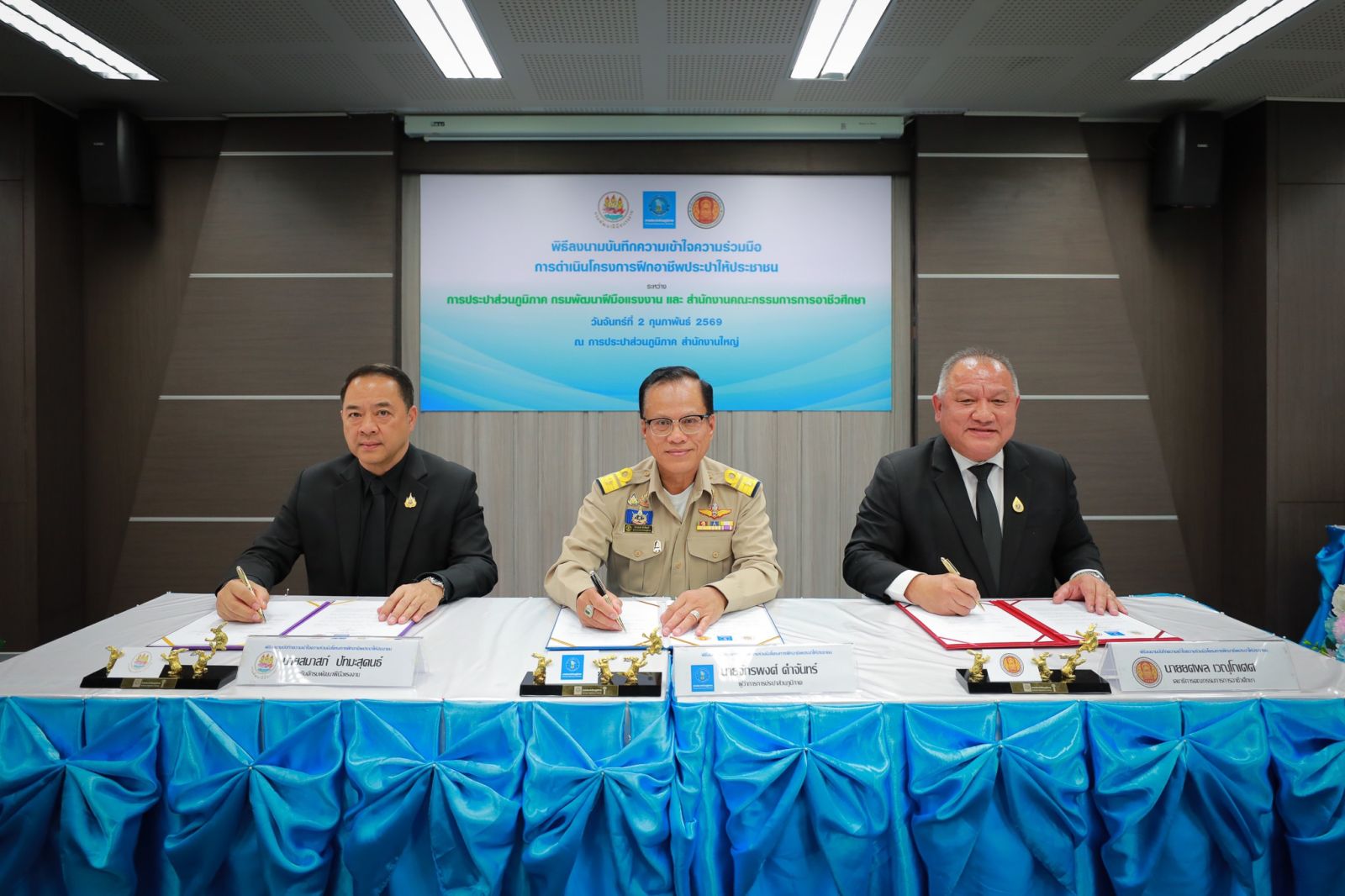 การประปาส่วนภูมิภาค (กปภ.) ลงนามบันทึกความเข้าใจความร่วมมือการดำเนินโครงการฝึกอาชีพประปาให้ประชาชน เพื่อบูรณาการความร่วมมือในการพัฒนาทักษะวิชาชีพช่างประปาและเสริมสร้างโอกาสในการประกอบอาชีพแก่ประชาชน ร่วมกับ กรมพัฒนาฝีมือแรงงาน (กพร.) และสำนักงานคณะกรรมการการอาชีวศึกษา (สอศ.) โดยมี นายจักรพงศ์ คำจันทร์ ผู้ว่าการ กปภ. นายสมาสภ์ ปัทมะสุคนธ์ อธิบดี กพร. นายยศพล เวณุโกเศศ เลขาธิการ สอศ. ร่วมลงนาม ณ การประปาส่วนภูมิภาค สำนักงานใหญ่ เมื่อวันที่ 2 กุมภาพันธ์ 2569