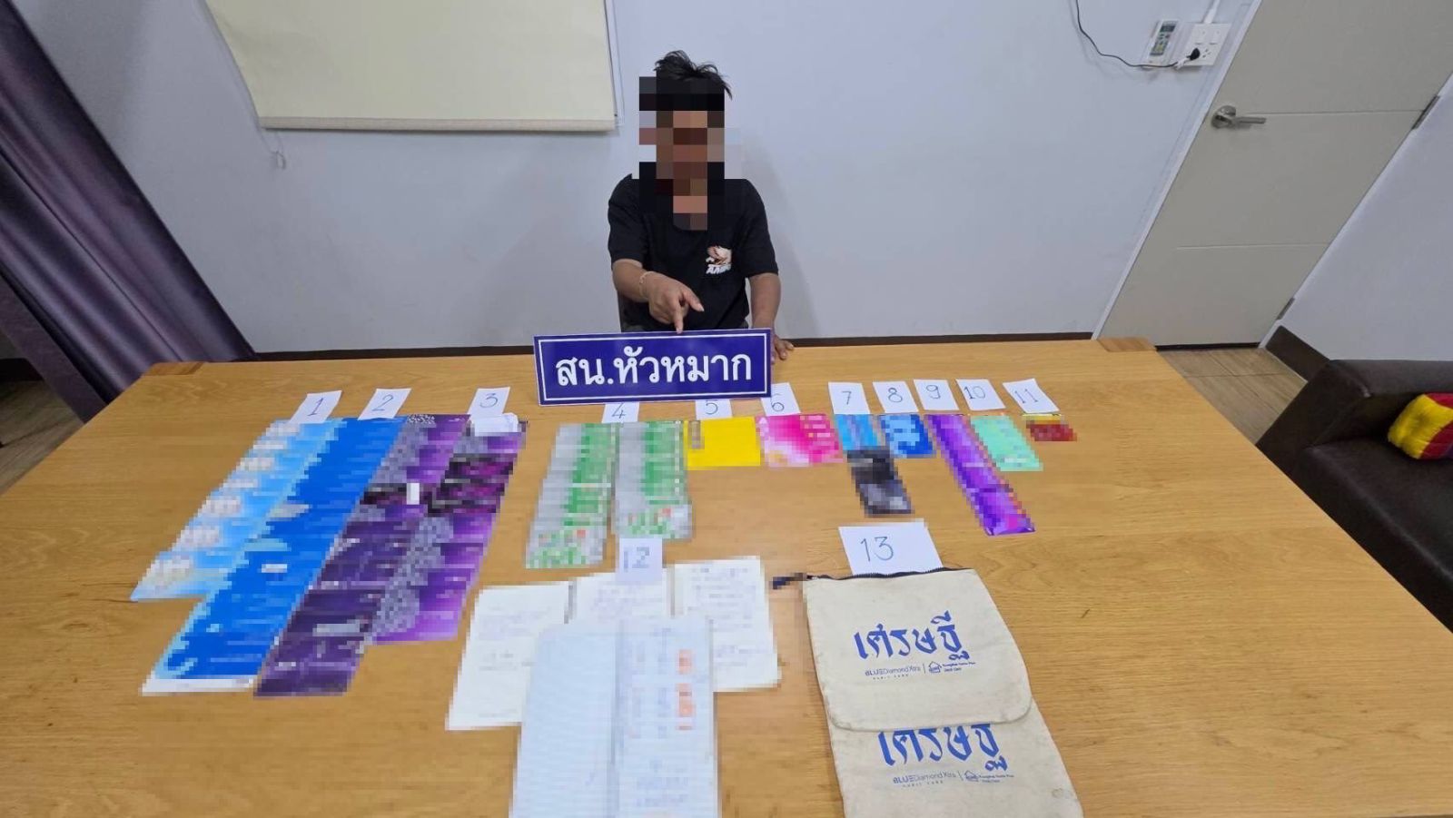 จากการตรวจค้นภายในห้องพัก พบของกลางจำนวนมาก ประกอบด้วย สมุดบัญชีเงินฝากรวมทั้งสิ้น 72 เล่ม และบัตรอิเล็กทรอนิกส์ (ATM) 55 ใบ จากหลายธนาคาร รวมถึงสมุดบันทึกรายการบัญชี 3 เล่ม และกระเป๋าผ้า อีก 2 ใบ
