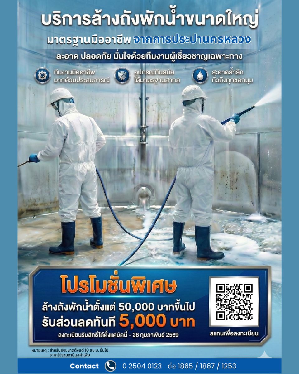 การประปานครหลวง (กปน.) เดินหน้ายกระดับความเชื่อมั่นด้านคุณภาพน้ำประปา พร้อมส่งเสริมสุขอนามัยของระบบน้ำภายในอาคาร เปิดตัวแคมเปญพิเศษบริการล้างถังพักน้ำขนาดใหญ่ พิเศษ! รับส่วนลดทันที 5,000 บาท เมื่อใช้บริการล้างถังพักน้ำขนาดใหญ่ มูลค่าตั้งแต่ 50,000 บาท ขึ้นไป สำหรับถังพักน้ำขนาดตั้งแต่ 10 ลูกบาศก์เมตร (10,000 ลิตร) ขึ้นไป (ราคายังไม่รวมภาษีมูลค่าเพิ่ม) สำหรับหน่วยงานและผู้ประกอบการ อาทิ โรงพยาบาล โรงงาน โรงแรม คอนโดมิเนียม และสถานประกอบการต่าง ๆ ใช้บริการล้างถังพักน้ำขนาดใหญ่ มุ่งเน้นความสะอาด ปลอดภัย และได้มาตรฐานสากล ด้วยทีมงานผู้เชี่ยวชาญของ กปน. และอุปกรณ์เทคโนโลยีที่ทันสมัย ยกระดับความสะอาด และความปลอดภัยของระบบน้ำประปาภายในอาคาร เพื่อสร้างความมั่นใจในคุณภาพน้ำที่ใช้อุปโภคบริโภค