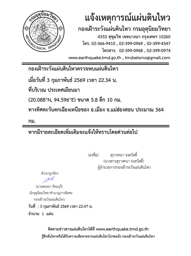 วันที่ 3 ก.พ. 2569 เวลา 22.34 น. กองเฝ้าระวังแผ่นดินไหว กรมอุตุนิยมวิทยา แจ้งเหตุ แผ่นดินไหว ขนาด 5.8 ความลึก 10 กม. ภายในพื้นที่ของประเทศเมียนมา (20.09°N,94.60°E) ศูนย์กลางห่างออกไปทางทิศตะวันตกเฉียงเหนือของ อ.เมือง จ.แม่ฮ่องสอน ประมาณ 364 กม. ขณะนี้ยังไม่มีรายงานผลกระทบต่อประเทศไทย
