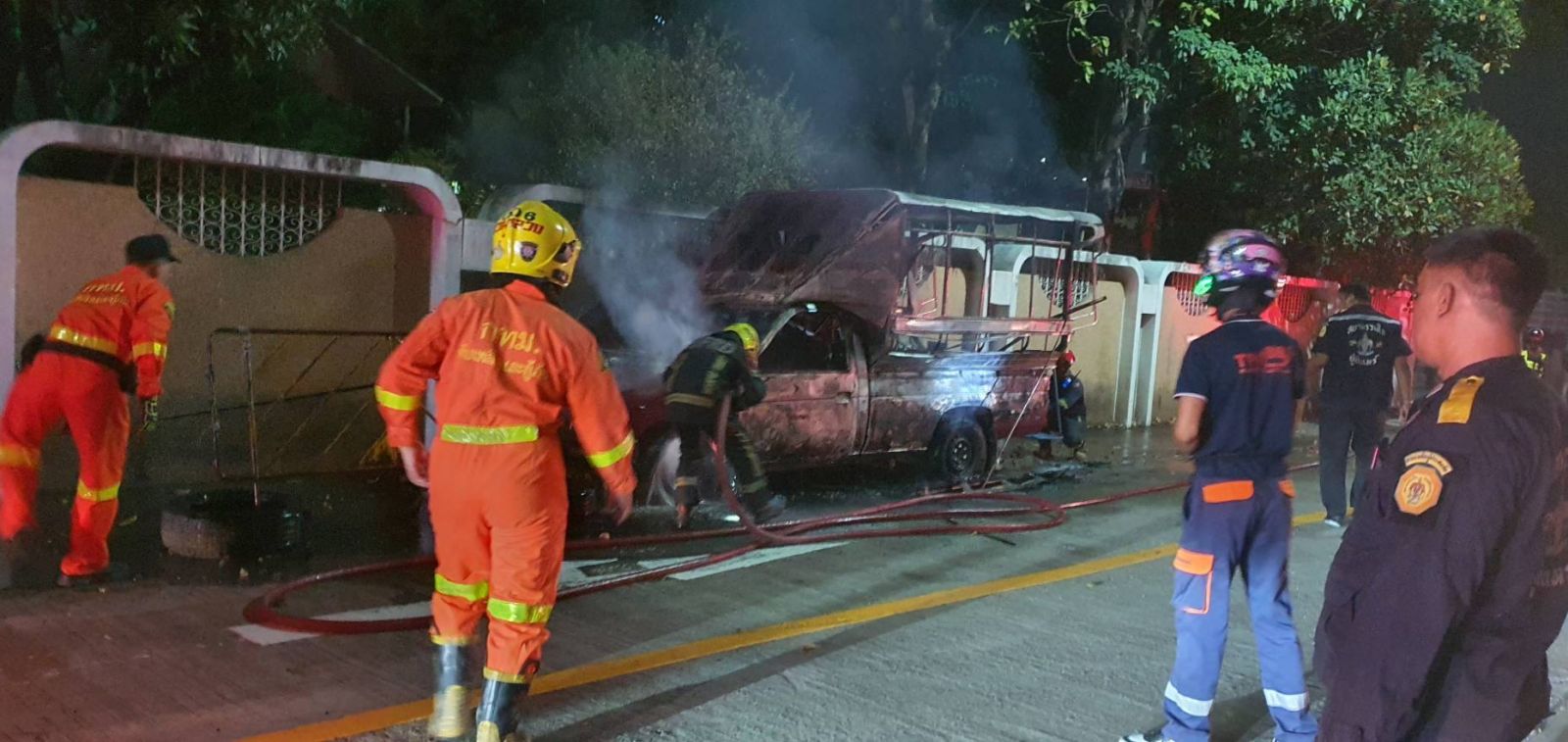 ลักษณะที่เกิดเหตุเป็นรถยนต์รับจ้างสาธารณะ ชนิดสองแถว สีแดง หมายเลขทะเบียน กรุงเทพมหานคร รถใช้น้ำมันดีเซลเป็นเชื้อเพลิง เพลิงลุกไหม้เสียหายหมดทั้งคัน และได้ลุกลามรถกระบะ สีขาว หมายเลขทะเบียน กรุงเทพมหานคร เสียหายฝากระโปรงส่วนหน้า รถดับเพลิงใช้น้ำทำการดับเพลิงสงบ