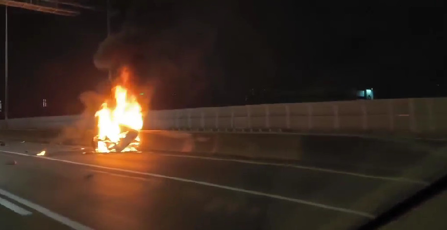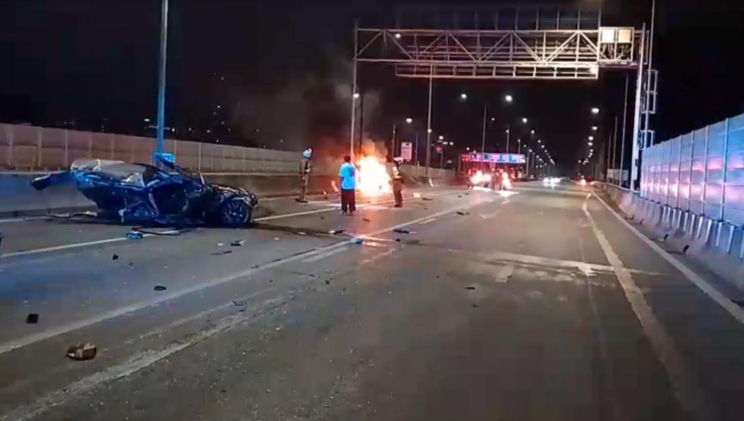 รถเก๋งยี่ห้อหรูเฉี่ยวชนกับรถแท็กซี่ ก่อนเสียหลักฟาดขอบทาง บนทางพิเศษศรีรัช สภาพรถขาดครึ่งแล้วเกิดเพลิงไหม้ จนท.เร่งช่วยเหลือผู้บาดเจ็บ 2 รายนำส่ง รพ.