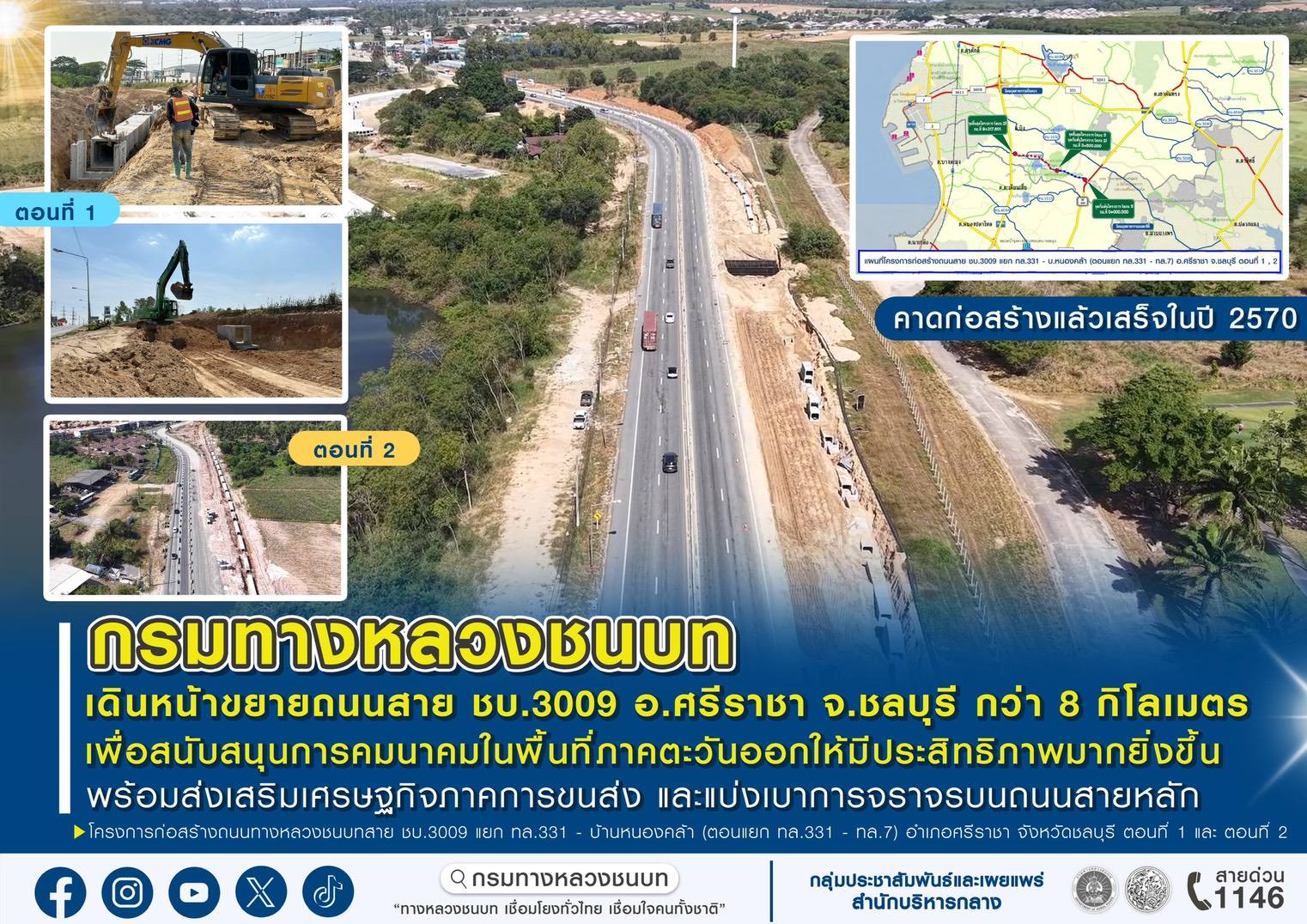 นายพิชิต หุ่นศิริ อธิบดีกรมทางหลวงชนบท เปิดเผยว่า กรมทางหลวงชนบท (ทช.) ได้ดำเนินโครงการก่อสร้างถนนทางหลวงชนบทสาย ชบ.3009 แยก ทล.331 - บ้านหนองคล้า (ตอนแยก ทล.331 - ทล.7) อำเภอศรีราชา จังหวัดชลบุรี เพื่อยกระดับโครงข่ายทางหลวงชนบทให้มีความสมบูรณ์ รองรับการขยายตัวของพื้นที่นิคมอุตสาหกรรม เชื่อมต่อการเดินทางขนส่งไปยังท่าเรือแหลมฉบัง เพิ่มความสะดวกรวดเร็วปลอดภัยในด้านการคมนาคมขนส่ง โดยโครงการดังกล่าวคาดว่าจะก่อสร้างแล้วเสร็จในปี 2570 ซึ่งแบ่งการดำเนินงานเป็น 2 ตอน ดังนี้