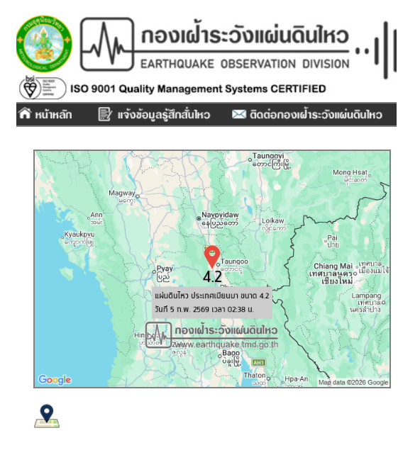 วันที่ 5 ก.พ. 2569 เวลา 02.38 น. กองเฝ้าระวังแผ่นดินไหว กรมอุตุนิยมวิทยา แจ้งเหตุ แผ่นดินไหว ขนาด 4.2 ความลึก 10 กม. ภายในพื้นที่ของประเทศเมียนมา (18.87°N,96.32°E) ศูนย์กลางห่างออกไปทางทิศตะวันตกเฉียงเหนือของ อ.ขุนยวม จ.แม่ฮ่องสอน ประมาณ 170 กม. ยังไม่มีรายงานผลกระทบต่อประเทศไทย