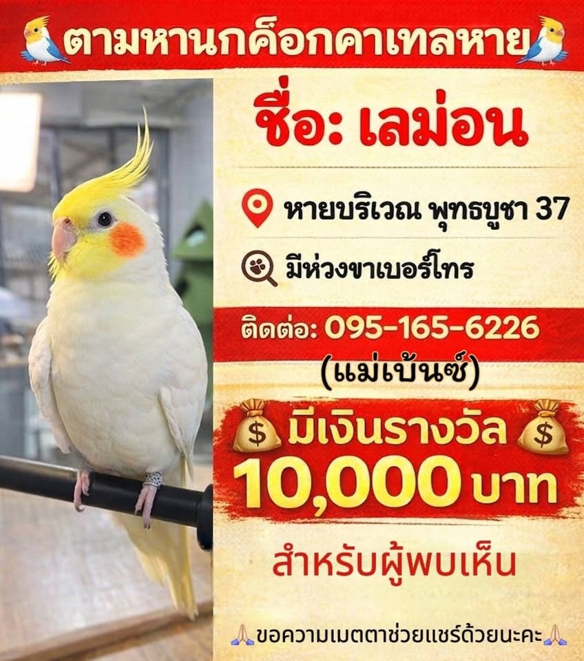 ตามหา 'เลม่อน' นกค็อกคาเทล หายที่ ซ.พุทธบูชา 27 เมื่อวันที่ 29 มกราคม 2569