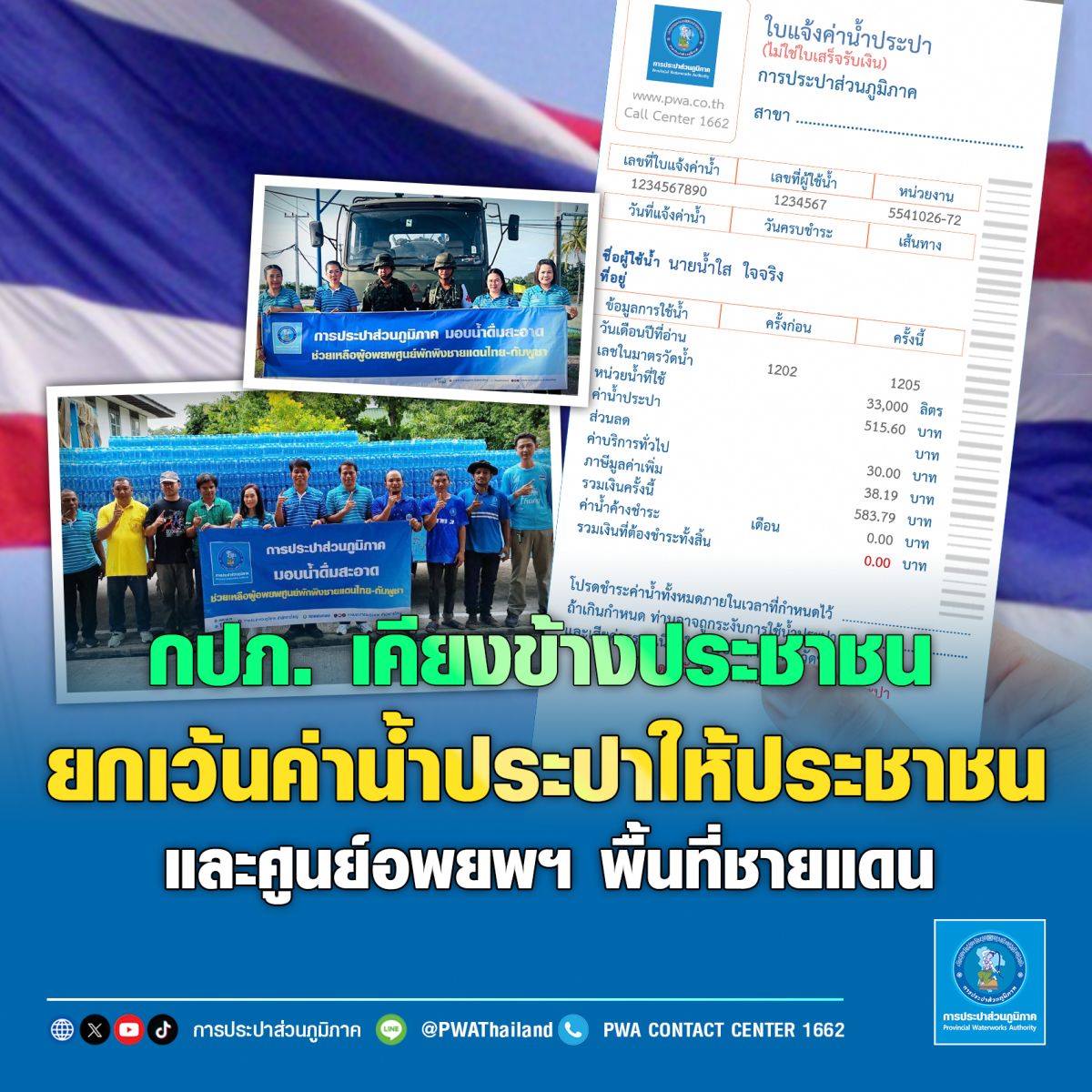 การประปาส่วนภูมิภาค (กปภ.) เผยมาตรการยกเว้นค่าน้ำประปาและค่าบริการทั่วไปให้ประชาชนและศูนย์อพยพหรือศูนย์พักพิงพื้นที่ชายแดนไทย-กัมพูชา ตลอดรอบบิลเดือนมกราคม 2569 และย้อนหลังสูงสุด 4 เดือนในจุดอพยพหลัก เพื่อบรรเทาความเดือดร้อนและลดภาระค่าใช้จ่ายให้แก่ผู้ประสบภัยในพื้นที่เสี่ยงภัยพิบัติกรณีฉุกเฉินอย่างทั่วถึง