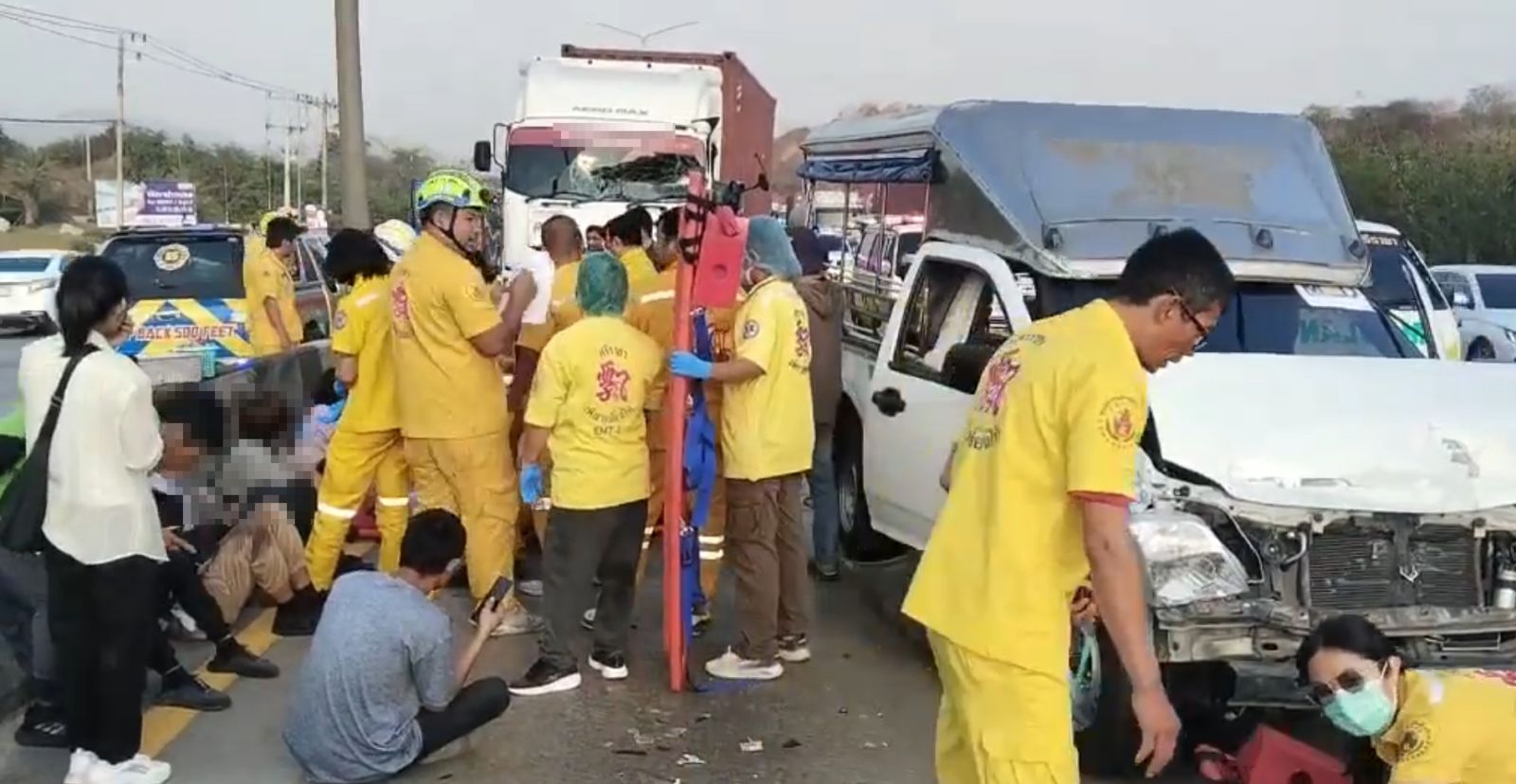 เมื่อเวลา 07.30 น. วันที่ 7 กุมภาพันธ์ 2569 พ.ต.ท.จิรพงศ์ สิทธิธัญลักษณ์ สว.สอบสวน สภ.หนองขาม อ.ศรีราชา จ.ชลบุรี ได้รับแจ้งว่าเกิดเหตุรถยนต์กระบะบรรทุกแรงงานชาวพม่า พุ่งชนรถยนต์ แล้วถูกรถบรรทุกชนซ้ำ มีผู้ได้รับบาดเจ็บ 18 ราย เหตุเกิดบนถนน 331 หน้าอุตสาหกรรมนิคมปิ่นทอง 3 ต.หนองขาม อ.ศรีราชา จ.ชลบุรี จึงรีบรุด ไปตรวจสอบพร้อมด้วยเจ้าหน้าที่หน่วยกู้ภัยเพียวเยี้ยงไท้ ศรีราชา
