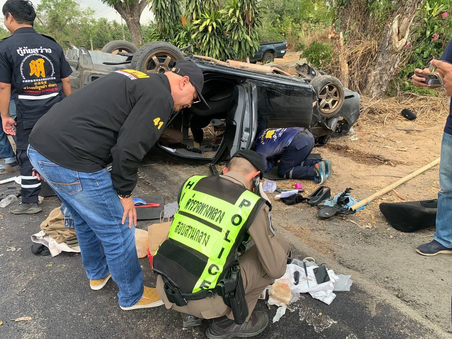 ที่เกิดเหตุ พบรถยนต์นั่งส่วนบุคคล ยี่ห้อโตโยต้า วีออส สีดำ หมายเลขทะเบียน 6752 ระยอง อยู่ในสภาพพลิกหงายท้อง ลักษณะพังเสียหายยับเยิน ข้าวของกระจัดกระจายเกลื่อนถนน ภายในรถพบคนขับเป็นชาย อายุประมาณ 40–50 ปี สวมเสื้อยืดสีแดง กางเกงขาสั้นสีเทา มีกระเป๋าสะพายคาดเอว และอมไฟแช็กไว้ในปาก มีอาการหายใจรวยริน