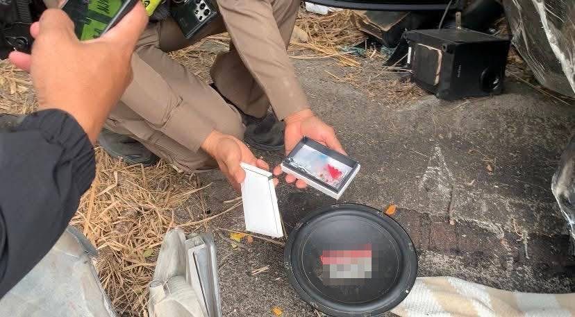 ต่อมาเจ้าหน้าที่ตำรวจ ได้ตรวจค้นภายในรถเพื่อหาสิ่งผิดกฎหมาย พบยาบ้าและยาไอซ์จำนวนหนึ่งอยู่ในกล่องตลับเหล็กขนาดเล็ก พร้อมอุปกรณ์การเสพยาเสพติด ถุงบรรจุยาแบบเป็นมัดที่ถูกแกะออกแล้ว และถุงพลาสติกซองเล็กสำหรับแยกบรรจุอีกจำนวนมาก