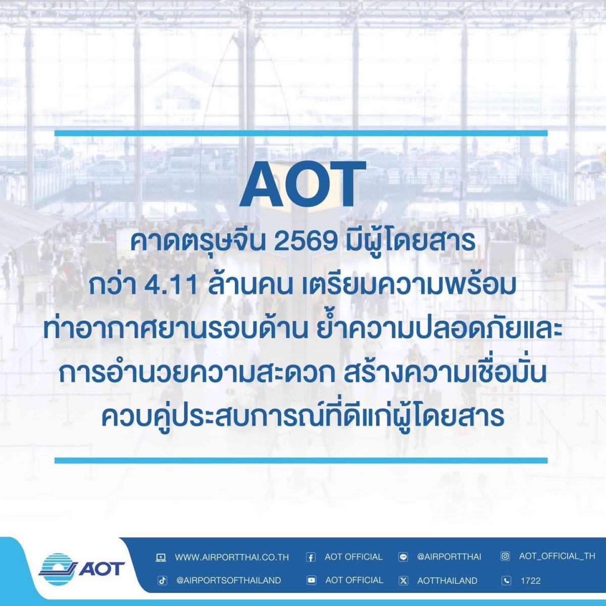 นางสาวปวีณา จริยฐิติพงศ์ กรรมการผู้อำนวยการใหญ่ AOT กล่าวว่า AOT คาดว่าในช่วงเทศกาลตรุษจีน ระหว่างวันที่ 13 - 22 กุมภาพันธ์ 2569 มีผู้โดยสารเดินทางผ่านท่าอากาศยานทั้ง 6 แห่ง ได้แก่ ท่าอากาศยานสุวรรณภูมิ (ทสภ.) ท่าอากาศยานดอนเมือง ท่าอากาศยานเชียงใหม่ ท่าอากาศยานแม่ฟ้าหลวง เชียงราย ท่าอากาศยานภูเก็ต และท่าอากาศยานหาดใหญ่ จำนวนกว่า 4.11 ล้านคน แบ่งเป็นผู้โดยสารระหว่างประเทศประมาณ 2.6 ล้านคน และผู้โดยสารภายในประเทศประมาณ 1.51 ล้านคน ขณะที่เที่ยวบินรวมคาดว่าจะมีประมาณ 24,847 เที่ยวบิน แบ่งเป็นเที่ยวบินระหว่างประเทศประมาณ 14,295 เที่ยวบิน และเที่ยวบินภายในประเทศประมาณ 10,552 เที่ยวบิน