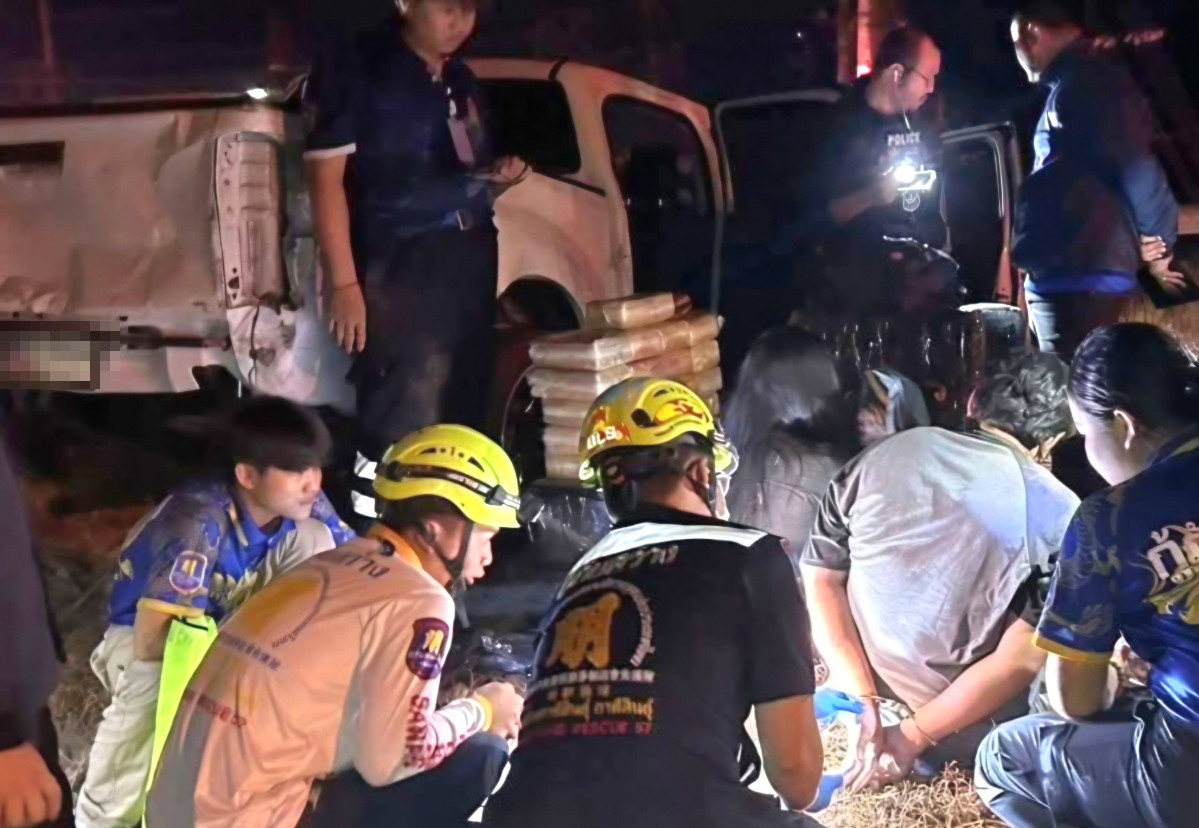 ในที่เกิดเหตุพบรถกระบะสีขาว ทะเบียน กรุงเทพมหานคร สภาพด้านหน้าพังยับเยินจากการพุ่งชนเสาไฟฟ้าจนหักโค่น ตรวจสอบภายในรถและบริเวณโดยรอบพบห่อของกลางยาเสพติด (ยาบ้า) บรรจุอยู่ในกระสอบจำนวนมาก นับรวมได้ประมาณ 1,200,000 เม็ด นอกจากนี้ยังมีรถยนต์ของประชาชนและเจ้าหน้าที่ได้รับความเสียหายอีก 2 คัน เนื่องจากผู้ต้องหาได้โปรยตะปูเรือใบลงบนพื้นถนนตลอดเส้นทางเพื่อหวังหลบหนีการจับกุม