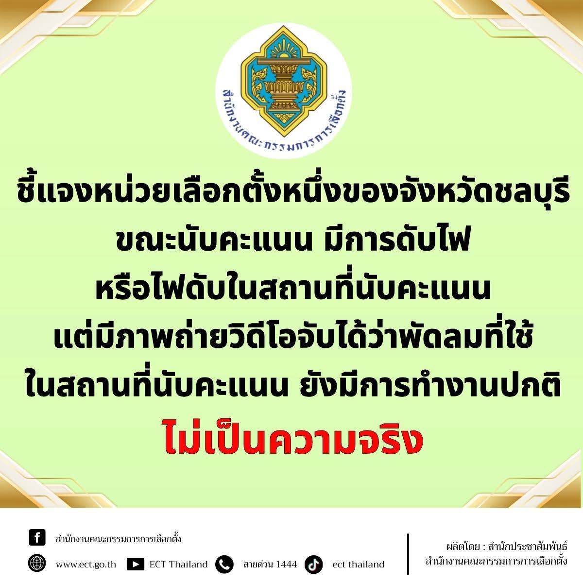 กกต. ชี้แจงหน่วยเลือกตั้งหนึ่งของจังหวัดชลบุรี ขณะนับคะแนน มีการดับไฟ หรือไฟดับในสถานที่นับคะแนน แต่มีภาพถ่ายวิดีโอจับได้ว่าพัดลมที่ใช้ในสถานที่นับคะแนน ยังมีการทำงานปกติ ไม่เป็นความจริง