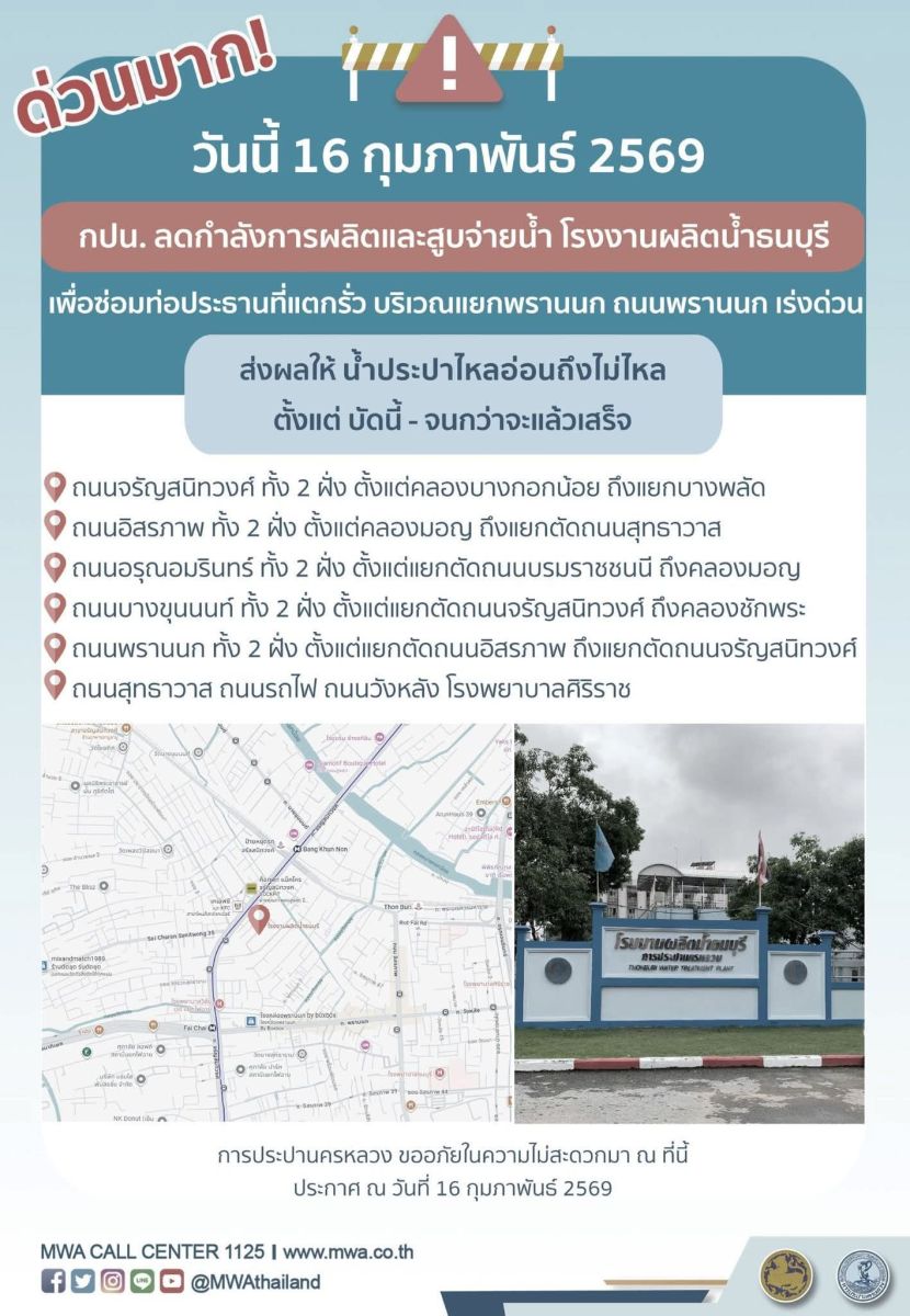ขณะนี้ (16 กุมภาพันธ์ 2569) ท่อประปาของการประปานครหลวง ( กปน.) แตกรั่ว เนื่องจากได้รับผลกระทบจากงานก่อสร้างบริเวณใกล้แยกพรานนก จึงมีความจำเป็นต้องเร่งซ่อมโดยเร็ว ส่งผลให้ น้ำประปาไหลอ่อนถึงไม่ไหล ในพื้นที่ดังต่อไปนี้
