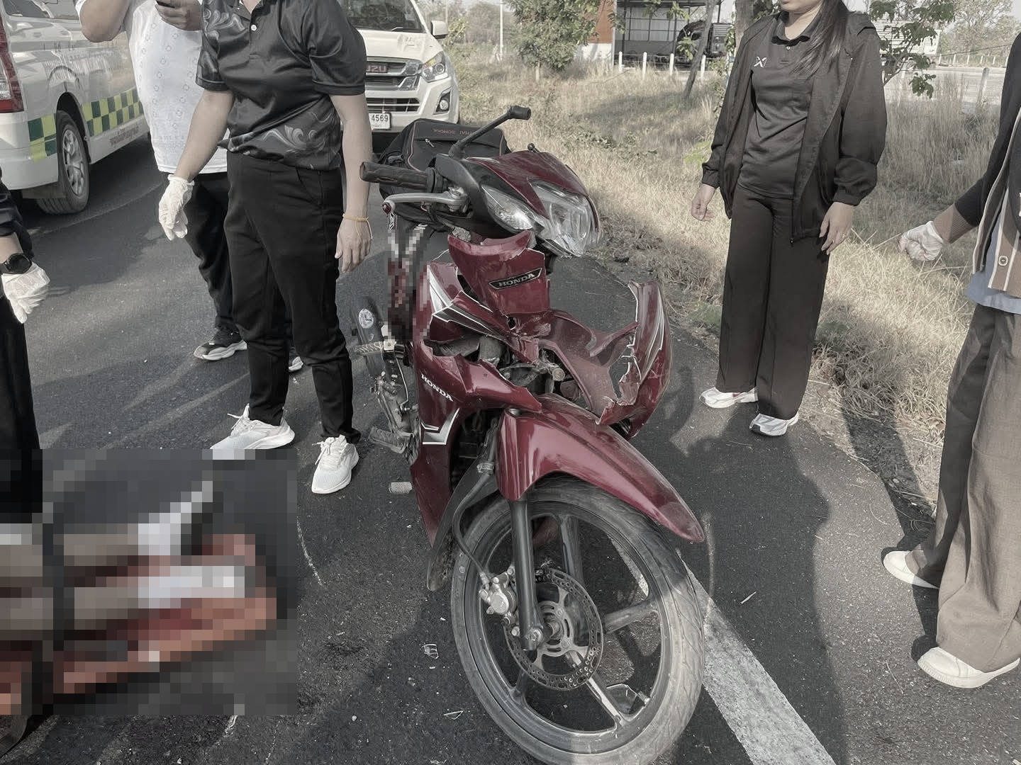 ที่เกิดเหตุ พบรถจักรยานยนต์ ฮอนด้า สีแดง สภาพหน้ารถพังเสียหาย ห่างออกพบรถ 4 ล้อการเกษตร บรรทุกไม้ จอดอยู่ข้างทาง ตรวจสอบ พบว่ามีผู้ได้รับบาดเจ็บชาย 1 ราย อาการสาหัสหมดสติ ไม่มีชีพจรมีเลือดออกหูจำนวนมาก ทางอาสาสมัครทำการ CPR พร้อมเครื่อง AED ที่เกิดเหตุ รอรถโรงพยาบาลโนนไทย แต่ได้เสียชีวิตในเวลาต่อมา ตรวจสอบเอกสาร เป็นชายไทย อายุ 17 ปี สวมชุดนักเรียนเสื้อสีขาว กาเกงขาสั้นสีน้ำเงิน ในส่วนของสาเหตุที่แท้จริงนั้นอยู่ที่การสอบสวนของเจ้าหน้าที่ตำรวจ สภ.โนนไทย