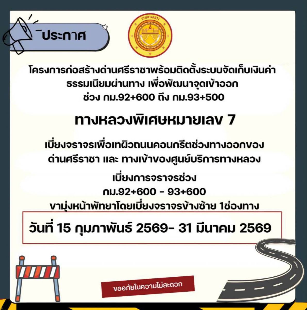 โครงการก่อสร้างด่านศรีราชาพร้อมติดตั้งระบบจัดเก็บเงินค่า ธรรมเนียมผ่านทาง เพื่อพัฒนาจุดเข้าออก ช่วง กม.92+600 ถึง กม.93+500 ตั้งแต่วันที่ 15 กุมภาพันธ์ 2569 - 31 มีนาคม 2569