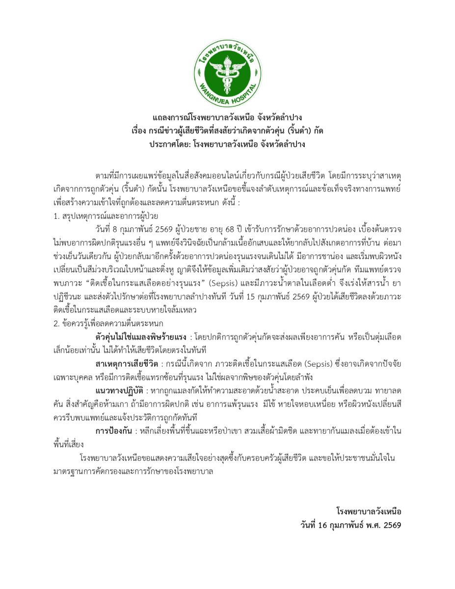 แถลงการณ์โรงพยาบาลวังเหนือ จังหวัดลำปาง เรื่อง กรณีข่าวผู้เสียชีวิตที่สงสัยว่าเกิดจากตัวคุ่น (ริ้นดำ) ตามที่มีการเผยแพร่ข้อมูลในสื่อสังคมออนไลน์เกี่ยวกับกรณีผู้ป่วยเสียชีวิต โดยมีการระบุว่าสาเหตุเกิดจากการถูกตัวคุ่น (ริ้นดำ) กัดนั้น โรงพยาบาลวังเหนือขอชี้แจงลำดับเหตุการณ์และข้อเท็จจริงทางการแพทย์เพื่อสร้างความเข้าใจที่ถูกต้องและลดความตื่นตระหนก