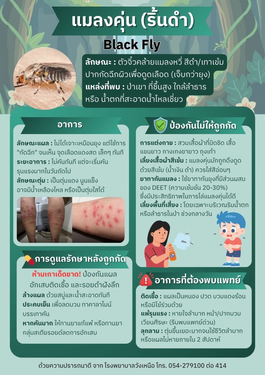 - แนวทางปฏิบัติ : หากถูกแมลงกัดให้ทำความสะอาดด้วยน้ำสะอาด ประคบเย็นเพื่อลดบวม ทายาลดคัน สิ่งสำคัญคือห้ามเกา หากมีอาการผิดปกติ เช่น อาการแพ้รุนแรง มีไข้ หายใจหอบเหนื่อย หรือผิวหนังเปลี่ยนสี ควรรีบพบแพทย์และแจ้งประวัติการถูกกัดทันที