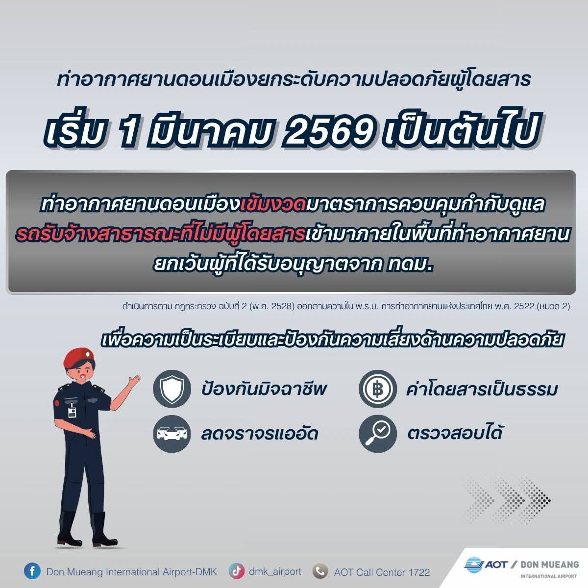 ตั้งแต่วันที่ 1 มีนาคม 2569 เป็นต้นไป ท่าอากาศยานดอนเมือง (ทดม.) เข้มงวดมาตรการควบคุมกำกับดูแลรถรับจ้างสาธารณะที่ไม่มีผู้โดยสารเข้ามาภายในพื้นที่ท่าอากาศยาน ยกเว้นผู้ที่ได้รับอนุญาตจาก ทดม. เพื่อความเป็นระเบียบและการป้องกันความเสี่ยงต่อความปลอดภัยของผู้เดินทาง