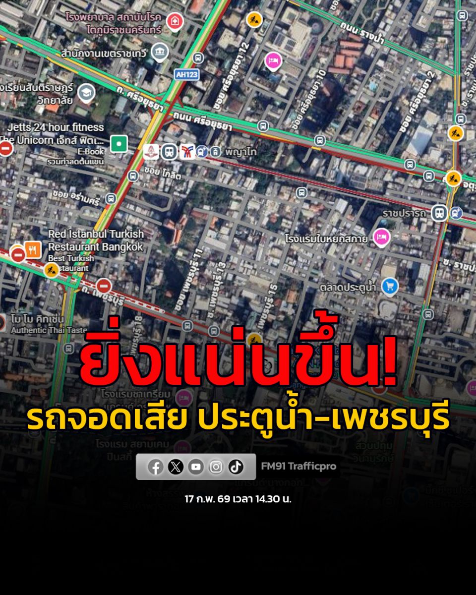 17 ก.พ. 69 เวลา 14.05 น. ถ.เพชรบุรี ขาออก จากแยกราชเทวี มุ่งหน้า ประตูน้ำ