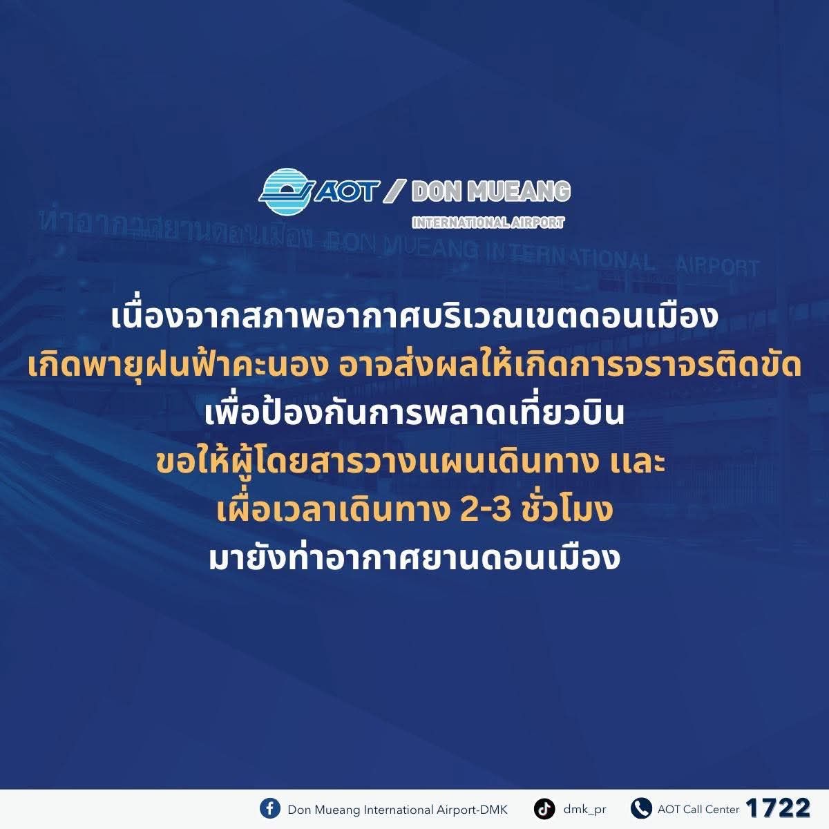 เนื่องจากขณะนี้มีฝนตกหนักในพื้นที่ดอนเมือง ซึ่งอาจส่งผลกระทบต่อสภาพการจราจรโดยรอบท่าอากาศยาน และทำให้การเดินทางใช้เวลานานกว่าปกติ