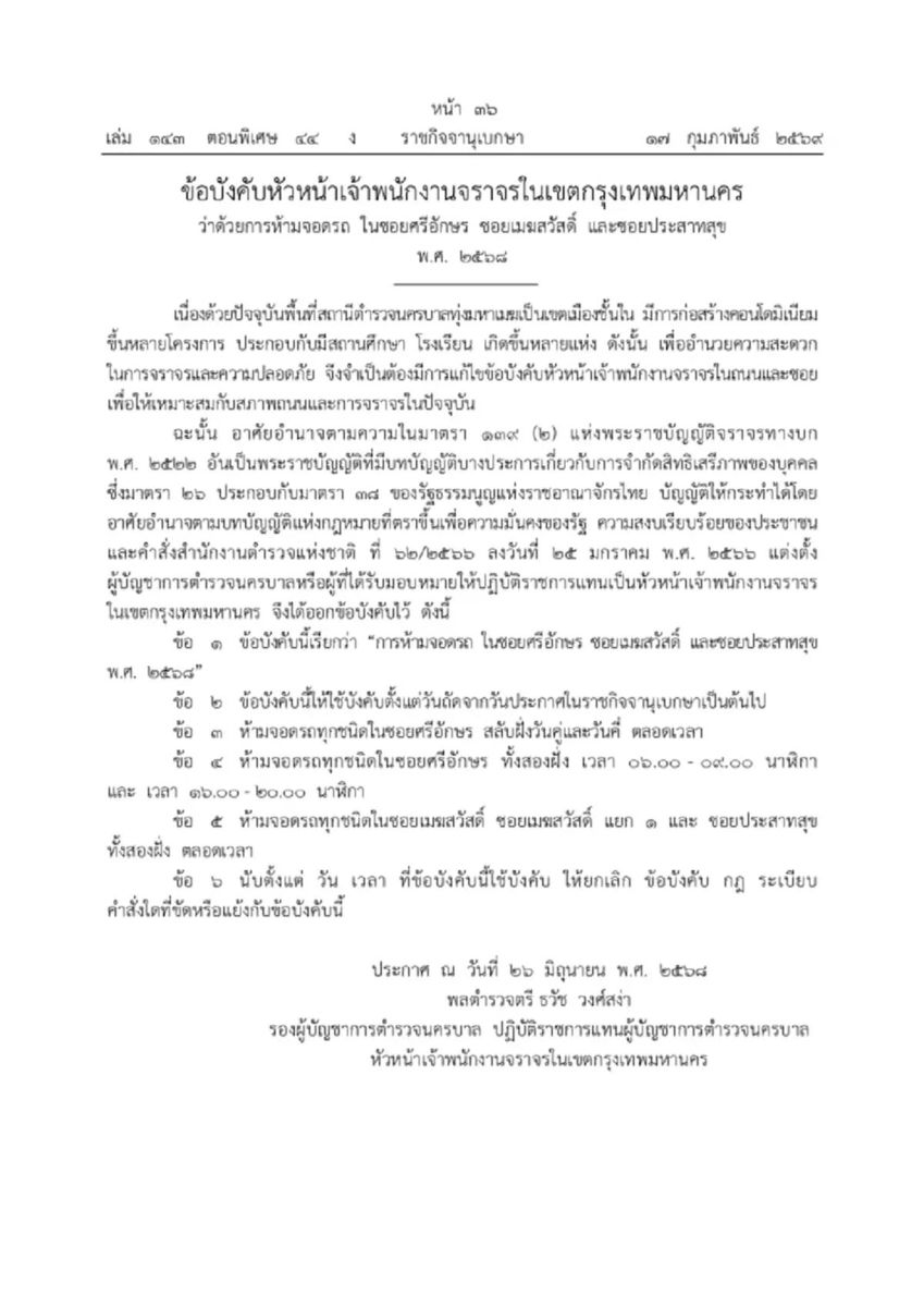 วันที่ 18 กุมภาพันธ์ 2569 ภายหลังเว็บไซต์ราชกิจจานุเบกษา เผยแพร่ ข้อบังคับหัวหน้าเจ้าพนักงานจราจรในเขตกรุงเทพมหานคร ว่าด้วยการห้ามจอดรถ ในซอยศรีอักษร ซอยเมฆสวัสดิ์ และซอยประสาทสุข พ.ศ. 2568 ประกาศข้อบังคับ ห้ามจอดรถทุกชนิด ใน 3 ซอย ย่านยานนาวา-สาธร มีผลแล้ว