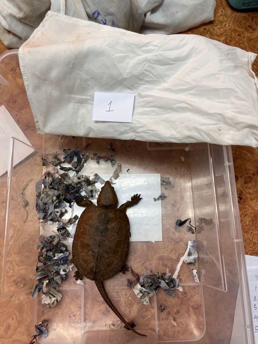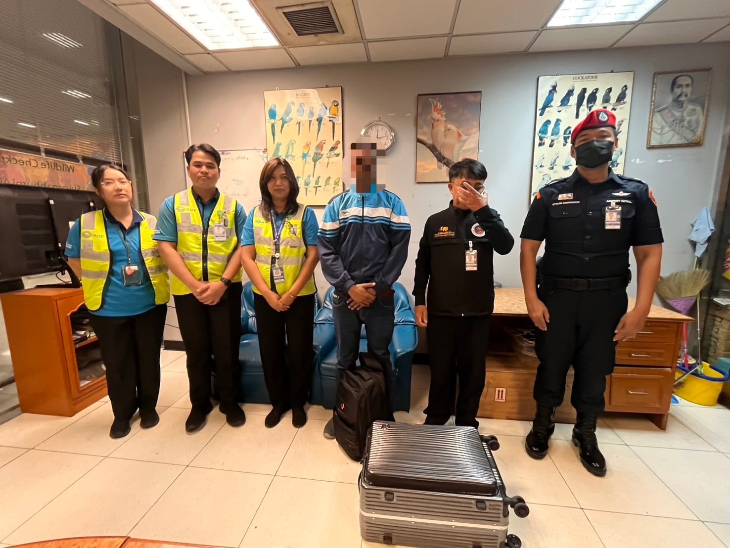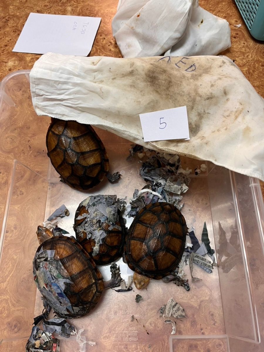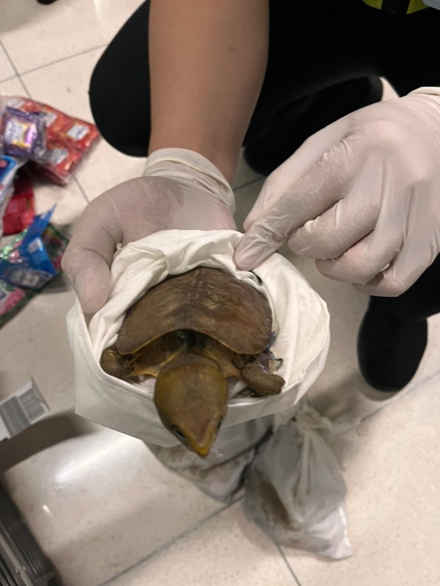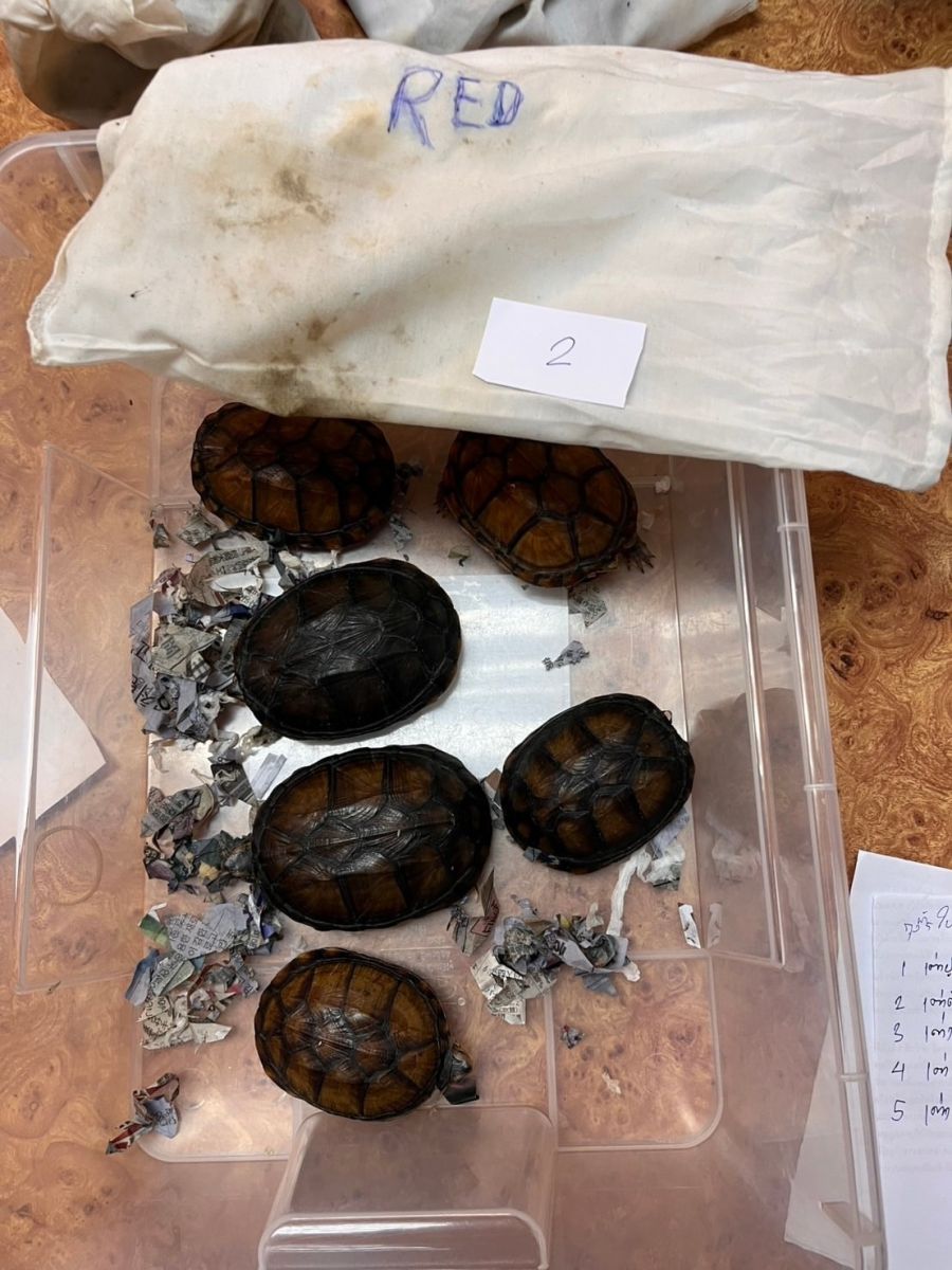 จากการตรวจค้น พบของกลางเป็นสัตว์ป่ามีชีวิต จำนวน 15 ตัว ประกอบด้วย ค่างมีชีวิต จำนวน 1 ตัว พบในตะกร้าพลาสติกทรงสี่เหลี่ยมสีเขียว 1 ใบ ชะนีมีชีวิต จำนวน 1 ตัว พบในตะกร้าพลาสติกทรงสี่เหลี่ยมสีฟ้า 5 ใบ เต่าปูลูและเต่าน้ำมีชีวิต จำนวน 13 ตัว พบในถุงผ้ารวม 5 ใบ ทั้งหมดถูกซุกซ่อนใส่ปะปนกับสัมภาระโหลดขึ้นเครื่องในกระเป๋าเดินทางทรงสี่เหลี่ยมมีล้อเลื่อน (tag 0217 TG 814495) สีเทา 1 ใบ รวมถึงโทรศัพท์มือถือสภาพเก่าใช้แล้ว ยี่ห้อ NOTHING PHONE 05 3.2 ซึ่งเป็นส่วนหนึ่งที่ใช้เป็นอุปกรณ์ในการกระทำผิด และยินยอมให้ทำการตรวจยึดไว้เป็นหลักฐาน