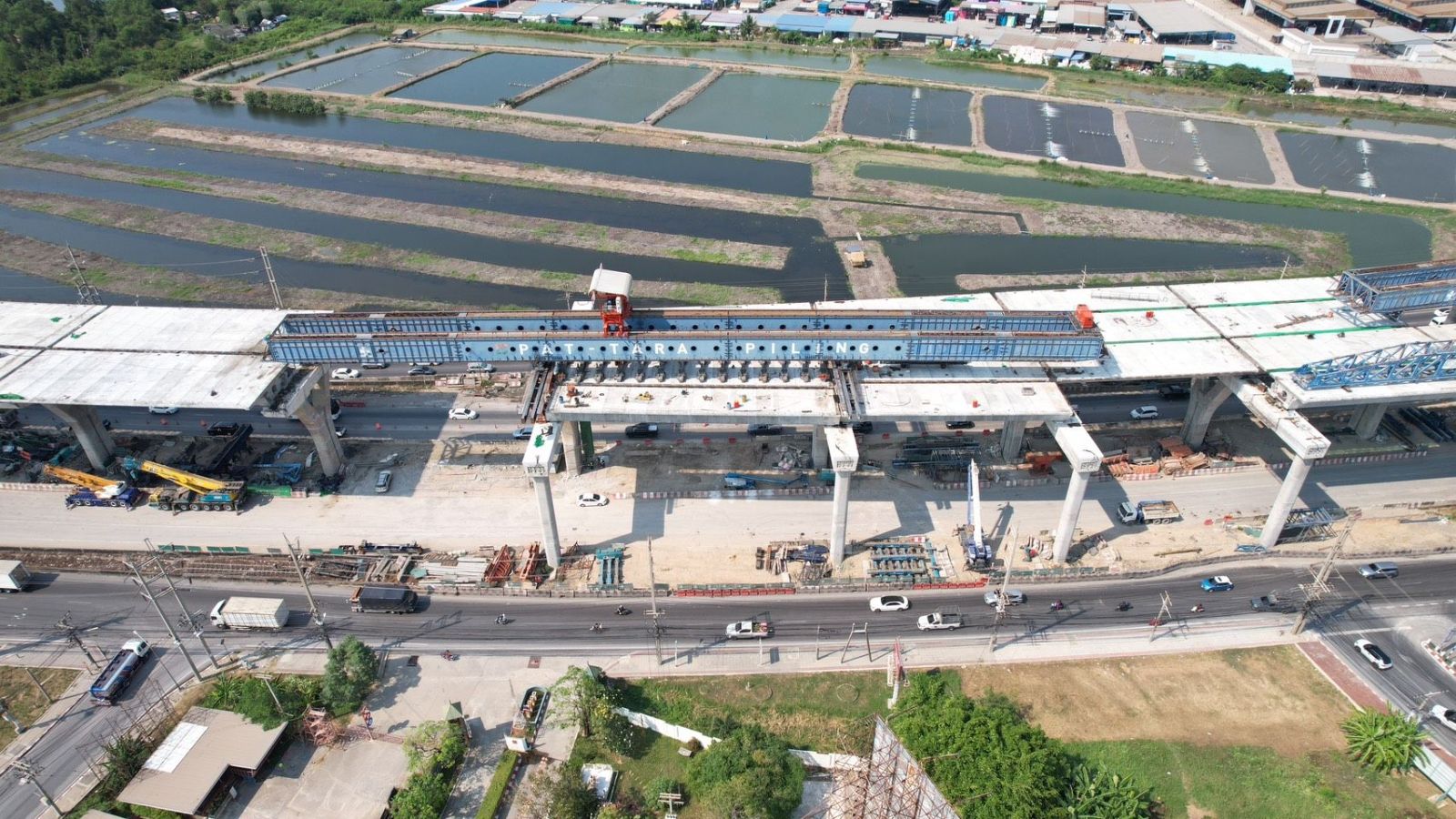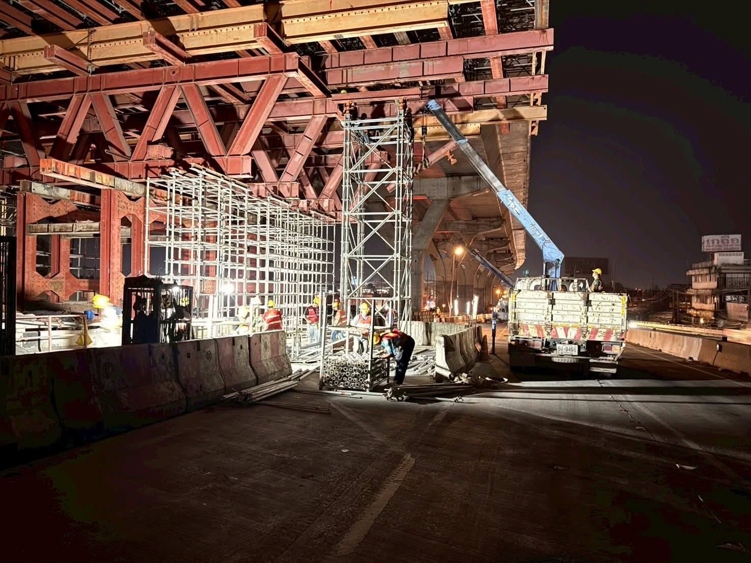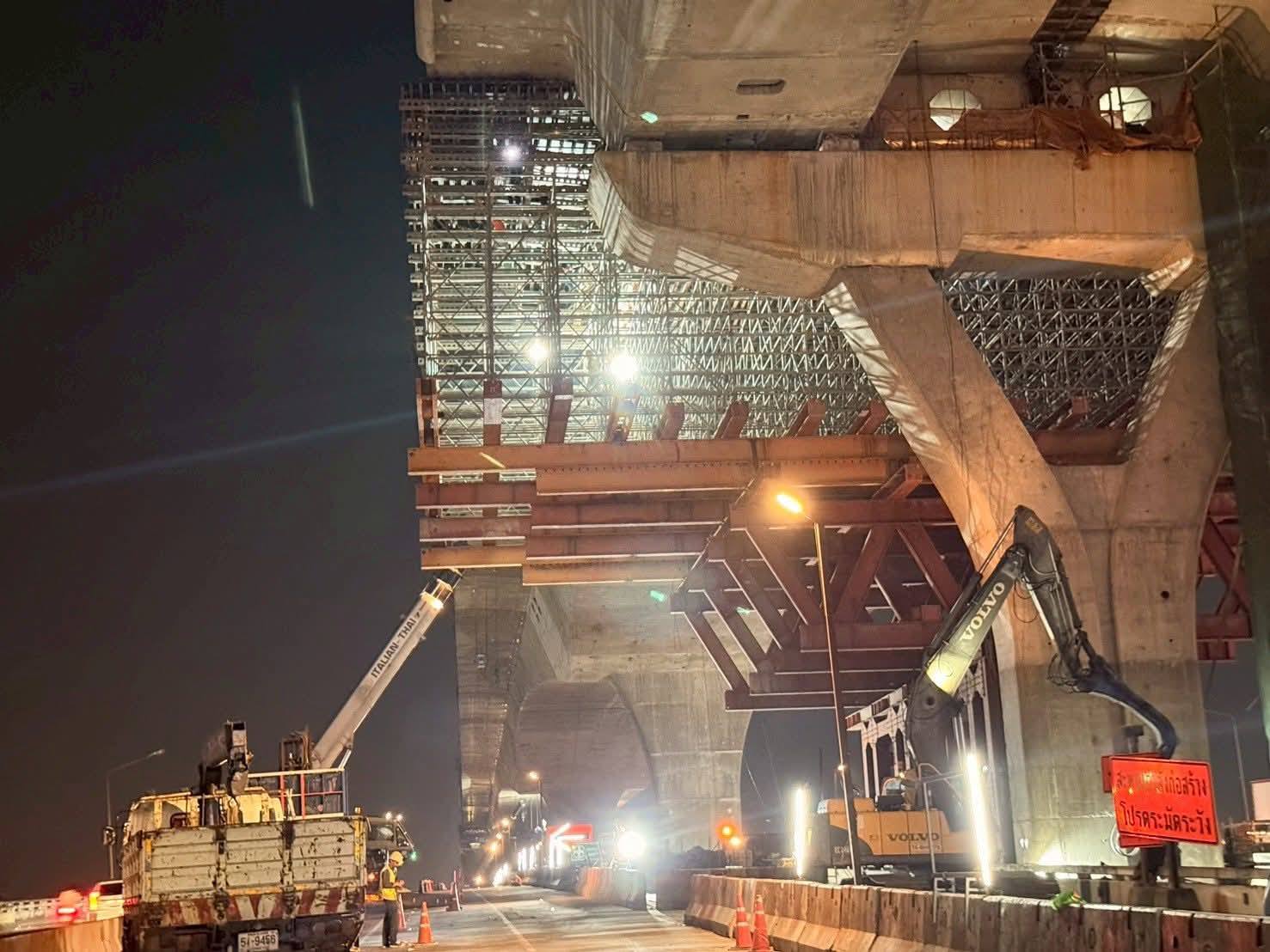 2. งานรื้อถอนโครงสร้างคานคอนกรีตอัดแรงที่เสียหายจากเหตุเครน LG ถล่ม: ปัจจุบันได้เคลื่อนย้าย LG มาติดตั้งบริเวณช่วง Span ที่จะรื้อถอนโครงสร้างคานที่เสียหายชุดแรก พร้อมติดตั้งอุปกรณ์ชุดแขวนชิ้นส่วนคานรูปกล่องแต่ละก้อน รวมถึงติดตั้งระบบตรวจวัดพฤติกรรมโครงสร้างในระหว่างปฏิบัติงานแบบ Real-time (Structural Health Monitoring) แล้วเสร็จเรียบร้อย โดยจะเริ่มขั้นตอนการปลดแรงในลวดอัดแรง (Tendon) และถ่ายน้ำหนัก (Load Transfer) ของ Segment ไปยังชุดแขวนฯ ในคืนวันที่ 19 - 20 ก.พ. 2569 นี้ จากนั้นจะเป็นขั้นตอนการตัดและยกชิ้นส่วนคานรูปกล่องทีละก้อนลงมา เพื่อขนย้ายออกจากพื้นที่ หลังจากนั้นจะเคลื่อนย้าย LG ไปติดตั้งบริเวณช่วง Span ถัดไปที่จะรื้อถอนโครงสร้างคานที่เสียหายชุดที่ 2 และดำเนินการตามขั้นตอนเดียวกันจนแล้วเสร็จต่อไป โดยคาดว่าการรื้อถอนโครงสร้างคานที่เสียหายทั้ง 2 ชุดจะแล้วเสร็จในช่วงกลางเดือนมีนาคม 2569 นี้ ซึ่ง "เร็วกว่าแผนเดิม" ที่กำหนดไว้ (27 มี.ค. 2569) ประมาณ 2 สัปดาห์