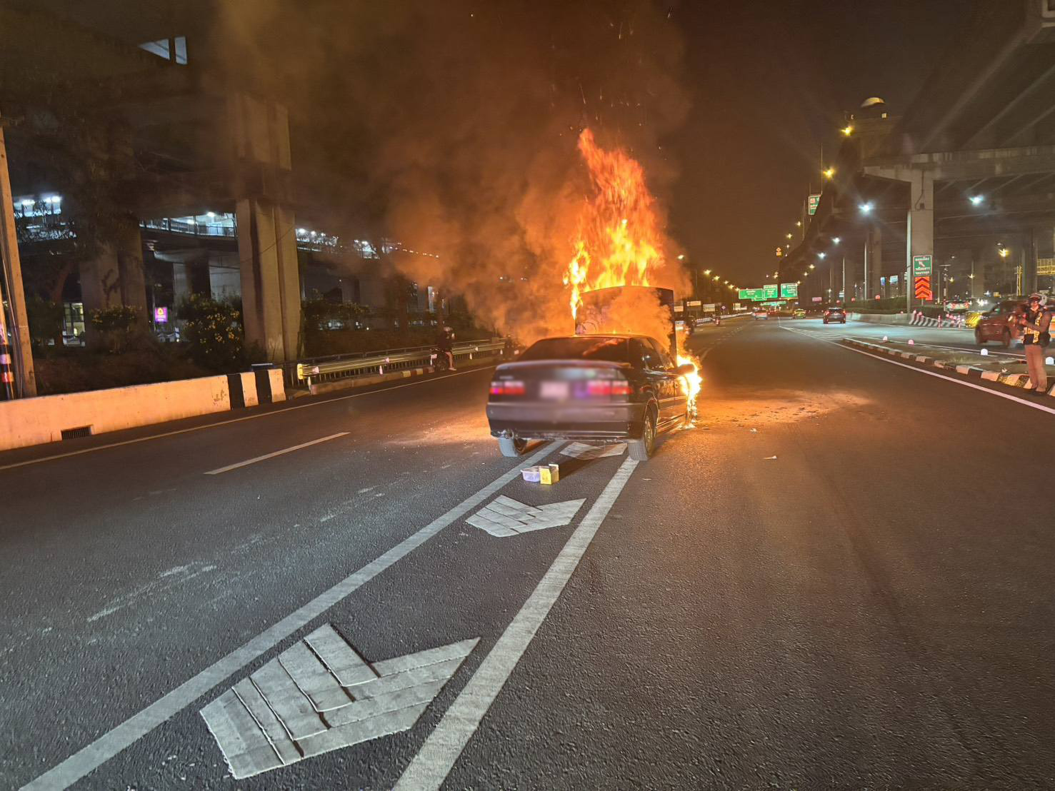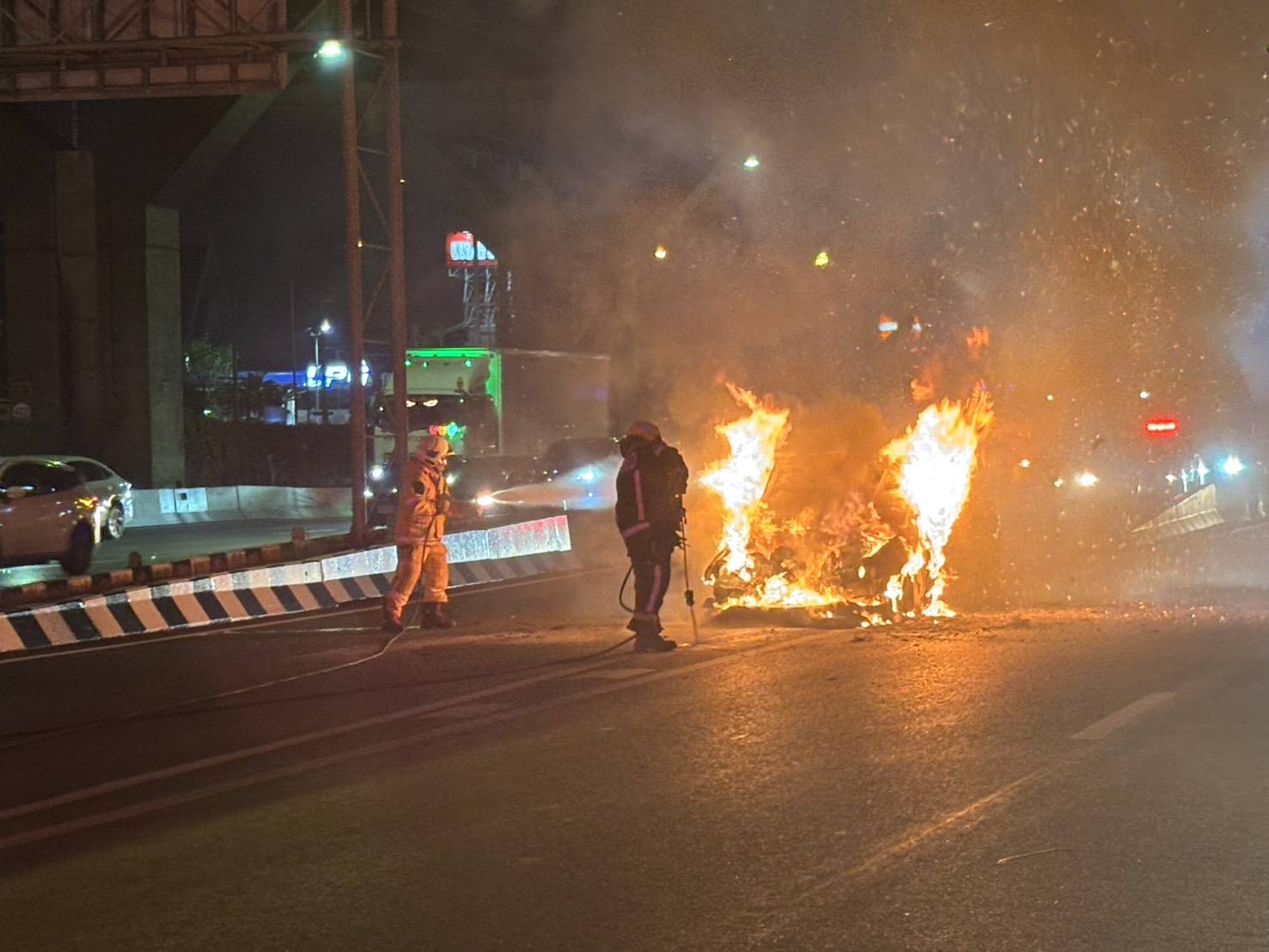 เพลิงไหม้รถยนต์ กลางถนนวิภาวดีรังสิต ก่อนถึงแยกหลักสี่ เจ้าหน้าที่เร่งฉีดน้ำสกัด เสียหายวอดทั้งคัน