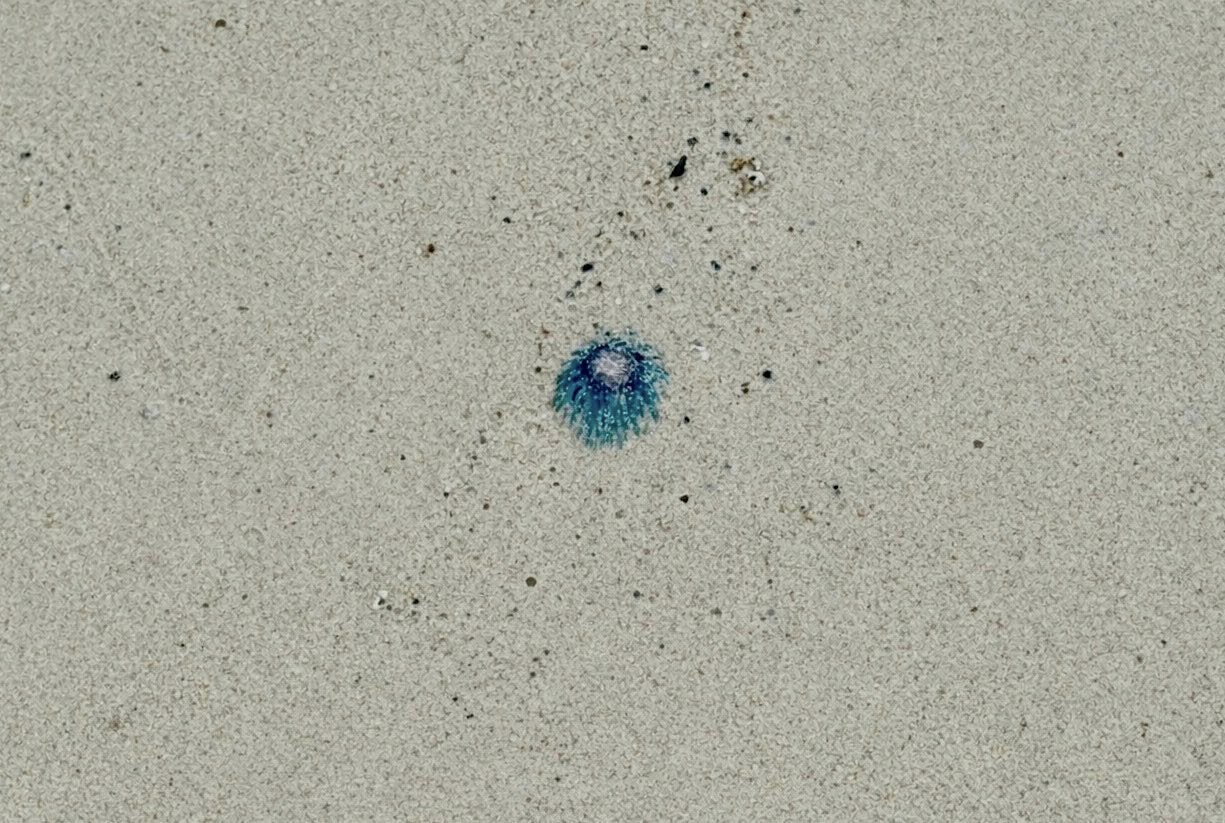 โดยแมงกะพรุนกระดุมฟ้า มีลักษณะเด่นสีฟ้าสดใส มีแผ่นกลมคล้ายกระดุมตรงกลาง และมีหนวดจำนวนมากรอบตัว มักลอยตามกระแสน้ำและถูกพัดเข้าฝั่ง แม้จะสวยงาม แต่ความอันตรายก็มี แม้พิษไม่รุนแรงเท่าแมงกะพรุนกล่อง แต่สามารถทำให้ ปวดแสบ ปวดจี๊ดทันทีเมื่อสัมผัสจะมีผื่นแดง บวม คัน หรือเกิดตุ่มน้ำใส และแม้เกยตื้นแล้วก็ยังสามารถทำให้แสบผิวได้ จึงควรหลีกเลี่ยงการสัมผัสโดยตรง